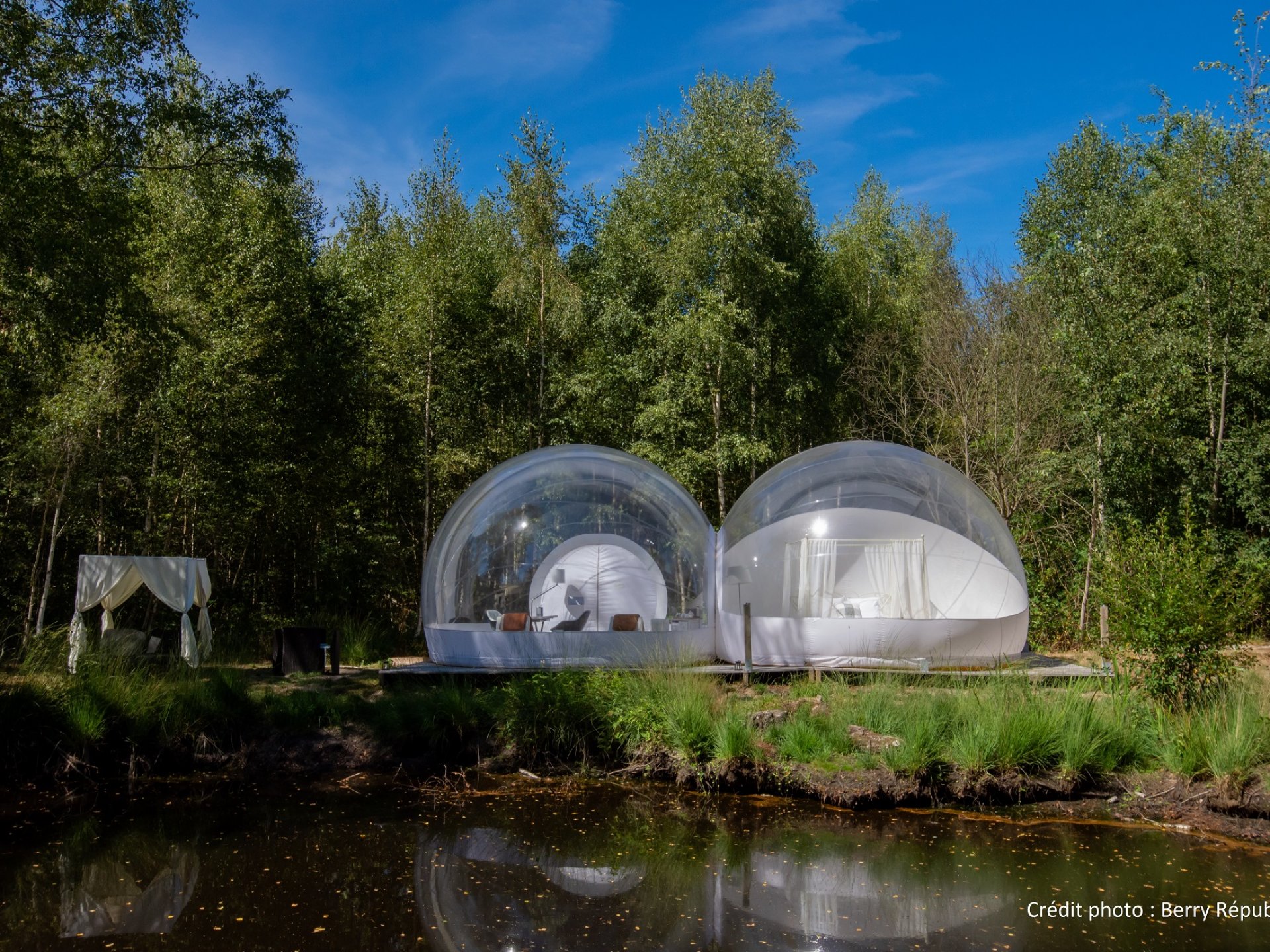 Une bulle king size qui permet de tirer profit de tous les bienfaits de la nature. Au bord de son étang, farniente et bain de soleil sont au programme. Et le soir venu, c’est en toute sécurité que l’on profite de la vue panoramique et du spectacle des étoiles.