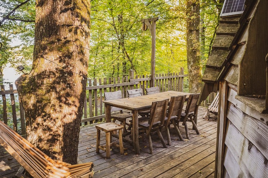 Pour partager un moment unique à deux, la Cabane Spa Echo est idéale ! Ce cocon dans les arbres est accessible par un double escalier.