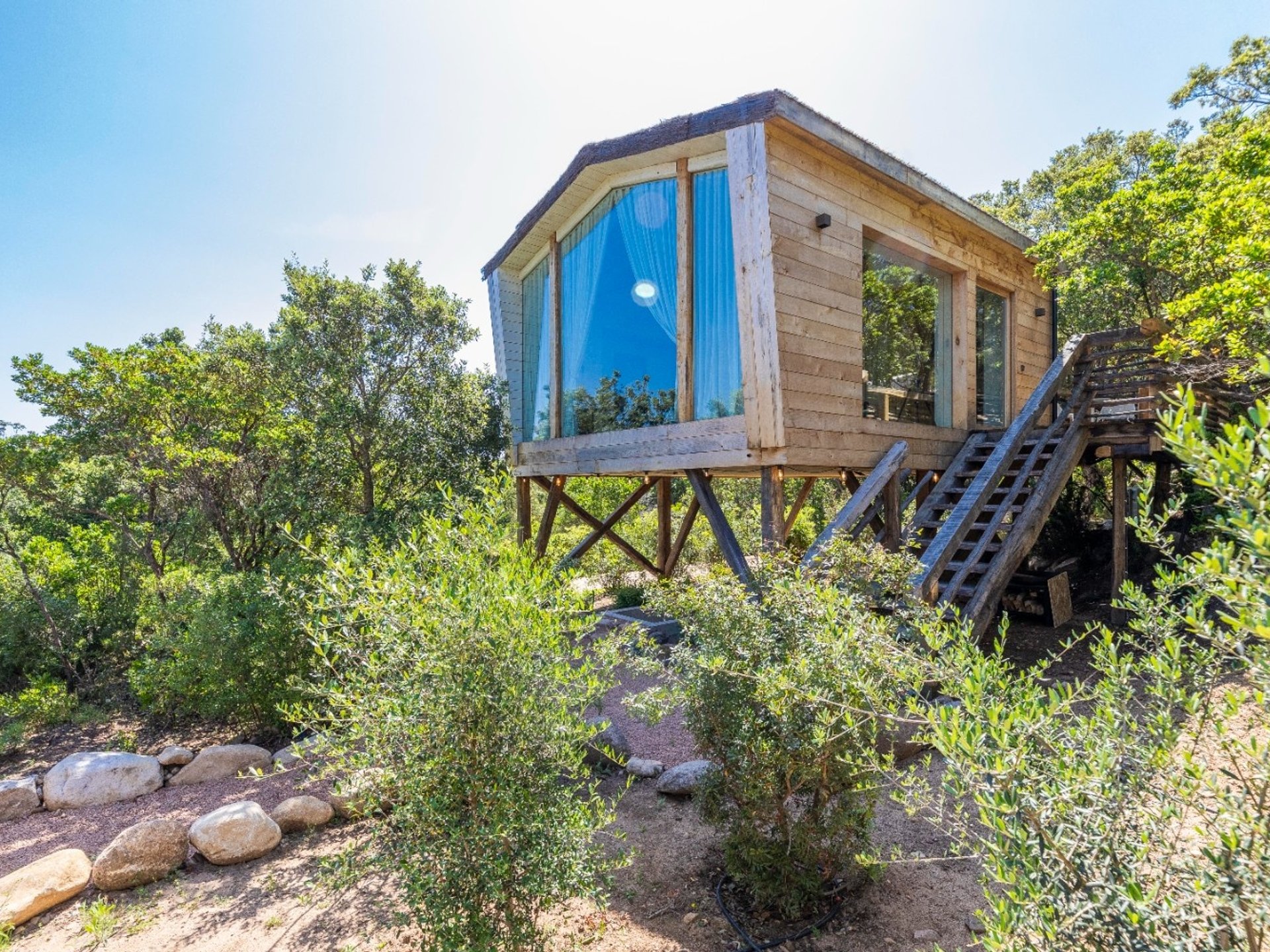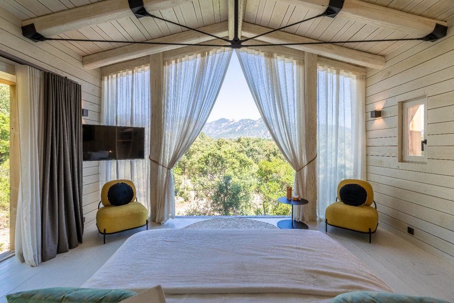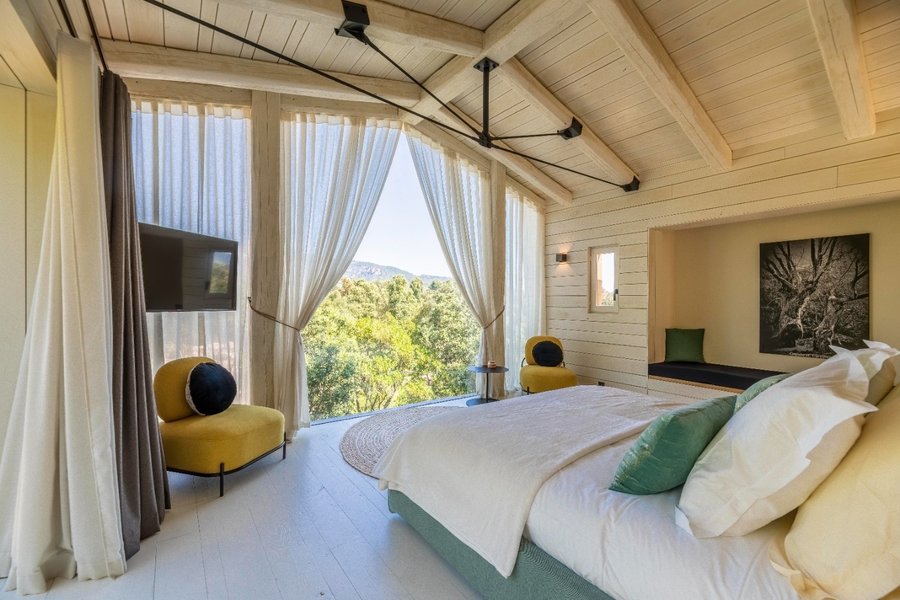 Nichée au cœur du maquis Corse, la cabane Pavo est une suite luxueuse avec une belle terrasse conçue pour les amoureux.