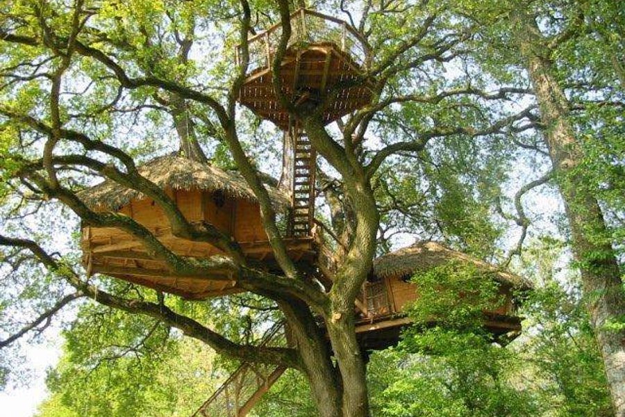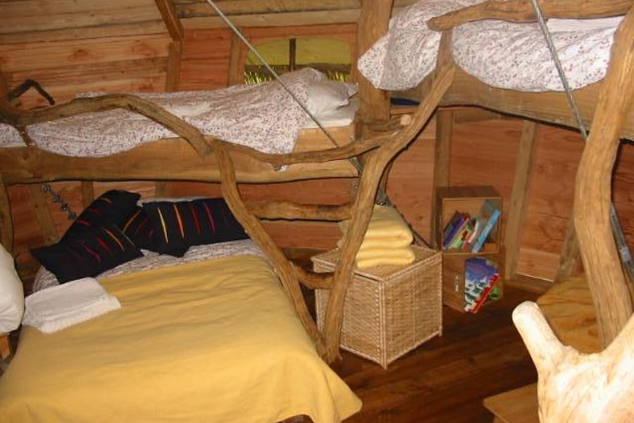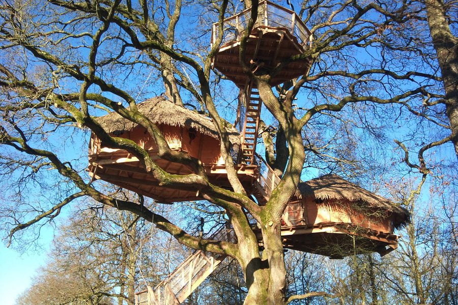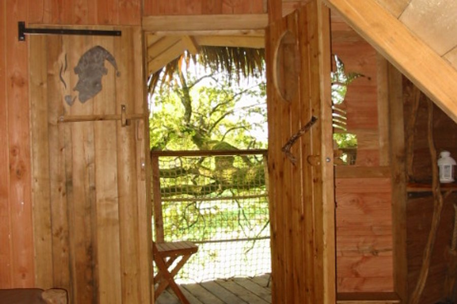 Cette cabane à 6m de haut est située dans le parc du château, en lisière, et la terrasse est équipée d'une table et de chaises, avec une vue imprenable sur les champs.