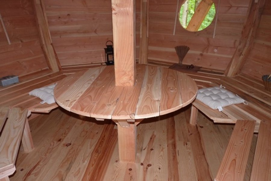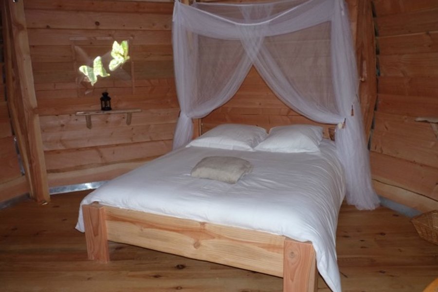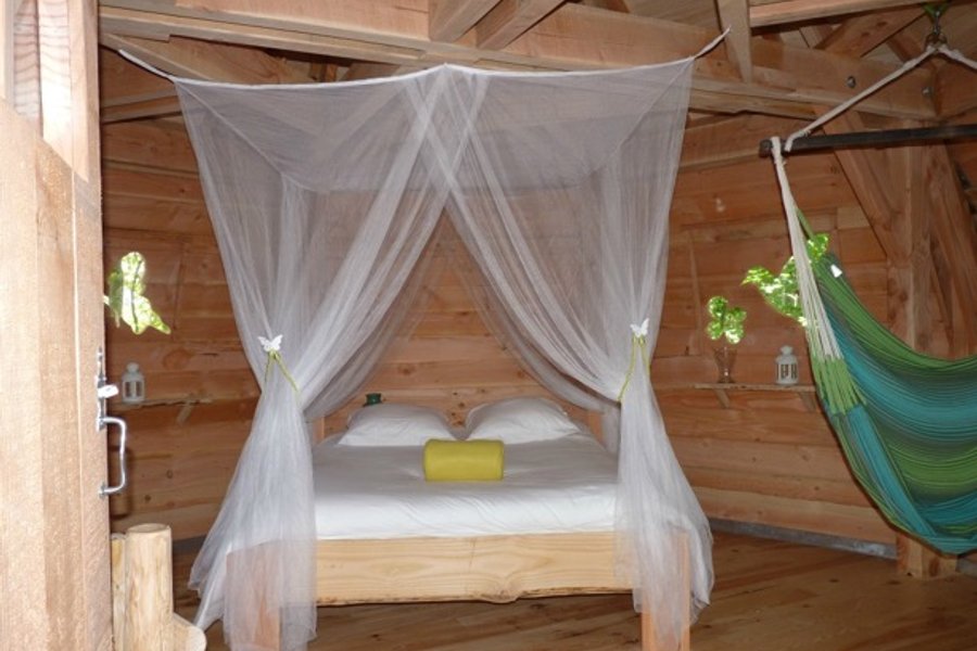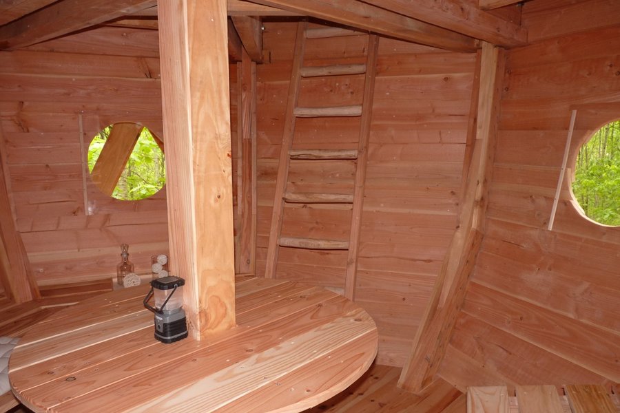 Perchée à 6 mètres de hauteur, en plein cœur d’une forêt de chênes d’Amérique, la Cabane Elona est idéale pour un couple. Elle se compose de deux niveaux avec un salon en partie inférieure et une chambre dans la partie supérieure.