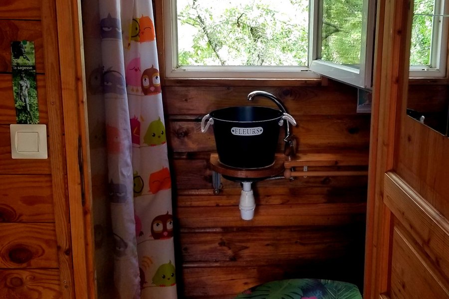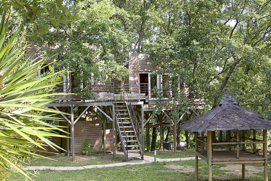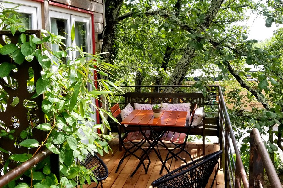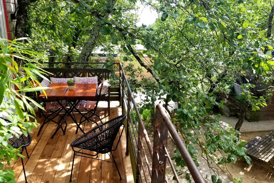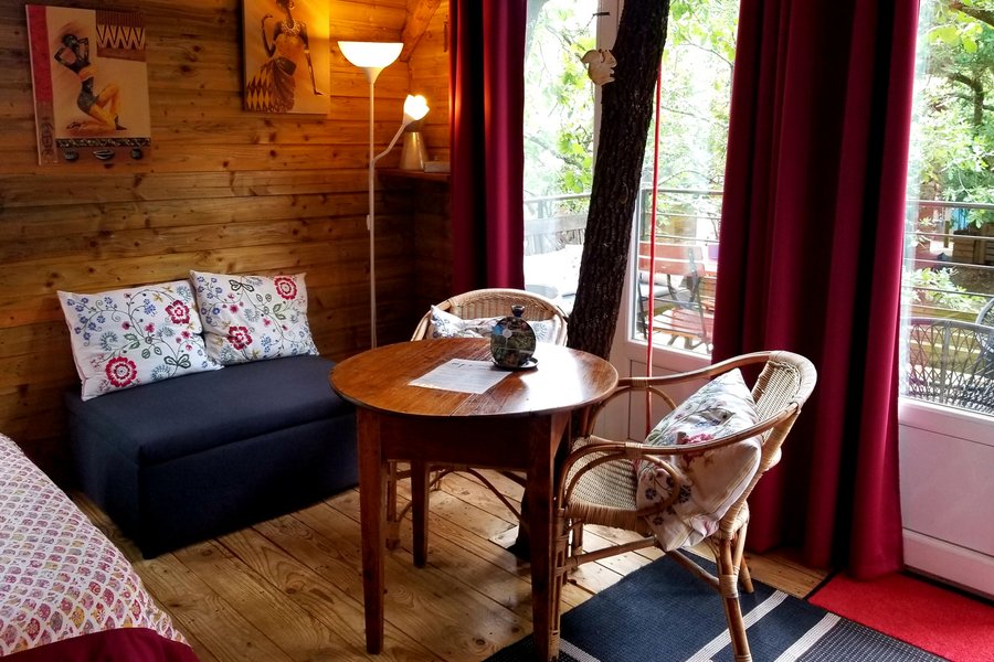 La cabane des « Ecureuils amoureux » est un petit studio perché dans les arbres. Traversée par un chêne, la cabane bouge au gré du vent…