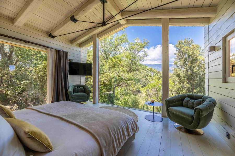 Nichée au cœur du maquis Corse, la cabane Pavo est une suite luxueuse avec une belle terrasse conçue pour les amoureux.