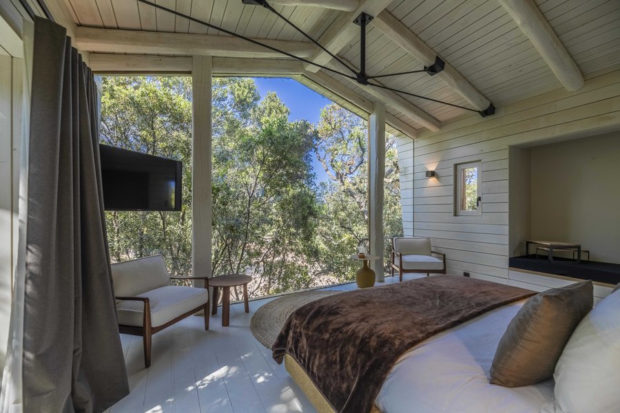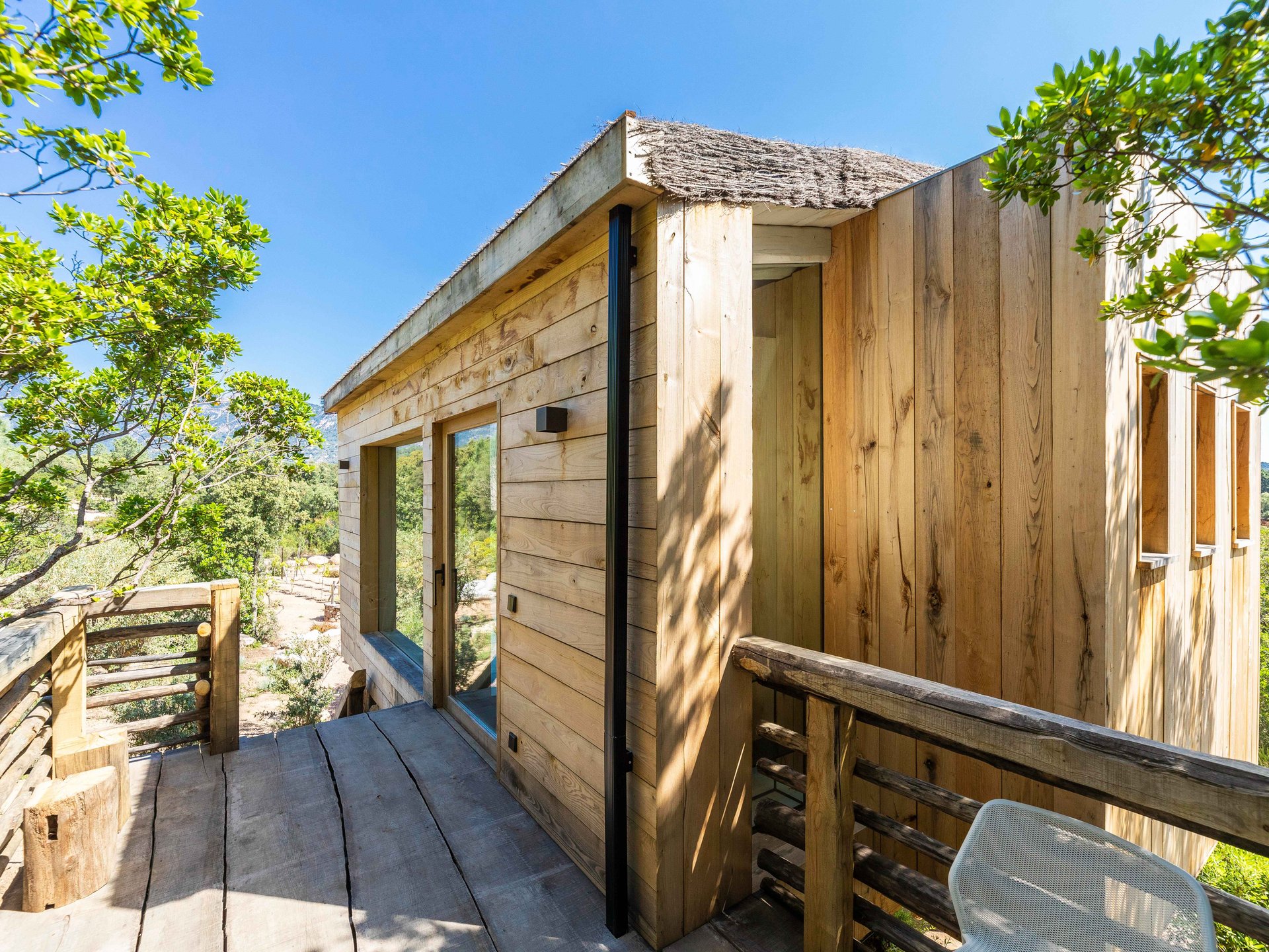 Nichée au cœur du maquis Corse, la cabane Pavo est une suite luxueuse avec une belle terrasse conçue pour les amoureux.
