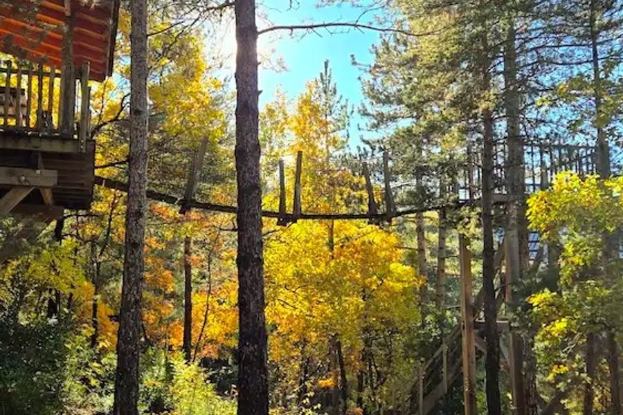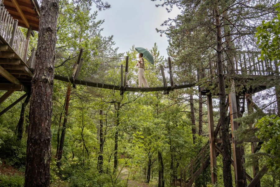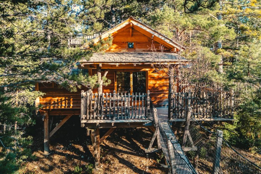 Cabane Bois d’Arambe – Une parenthèse suspendue entre ciel et forêtPerchée à 6 mètres de hauteur, la cabane Bois d’Arambe se niche dans la pinède du domaine ALPINEST – Les Cabanes du Pas de la Louve.