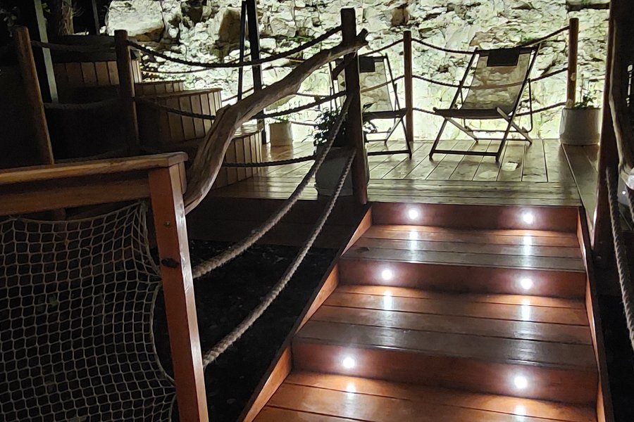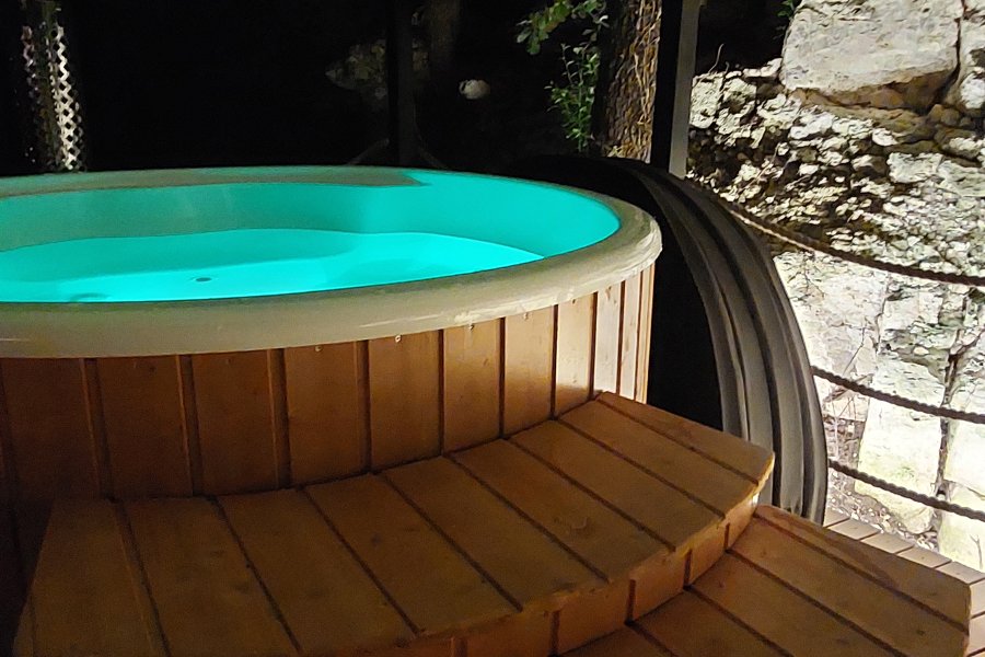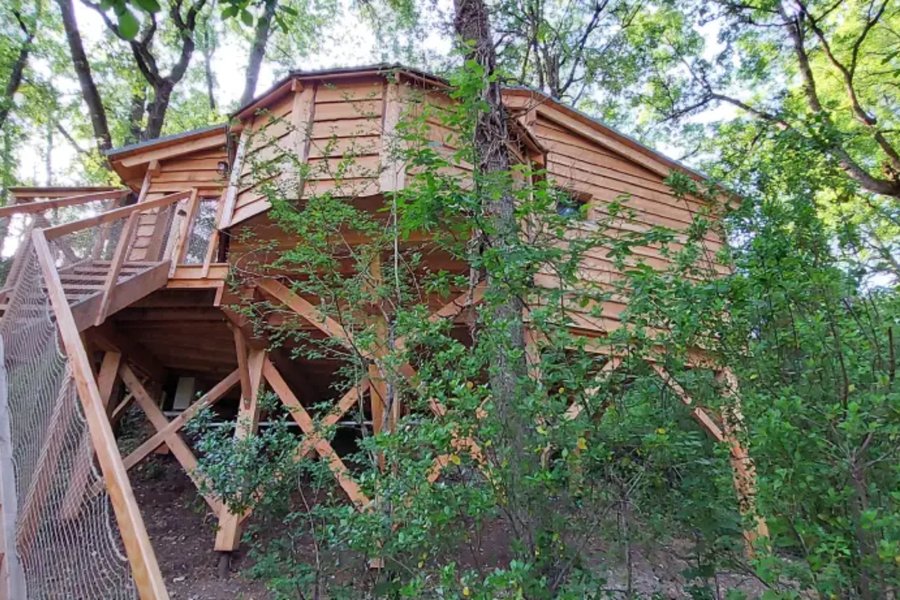 Nichée à quelques mètres du sol, la cabane perchée GAÏA, d’une superficie de 30 m², offre un havre de paix enveloppé par le feuillage des chênes centenaires et les roches naturelles qui forment une cavité intime.Vous allez adorer l’espace balnéothérapie privé avec bain nordique et……