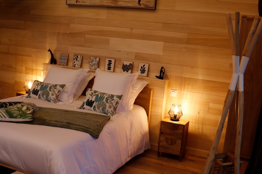 Plongez dans une atmosphère tropicale inspirée de la jungle indonésienne, avec une décoration verdoyante mettant en scène des perroquets, des bananiers et un mobilier en bois clair, créant ainsi une ambiance naturelle et zen.Cette cabane lodge offre un cadre chaleureux et confortable,……