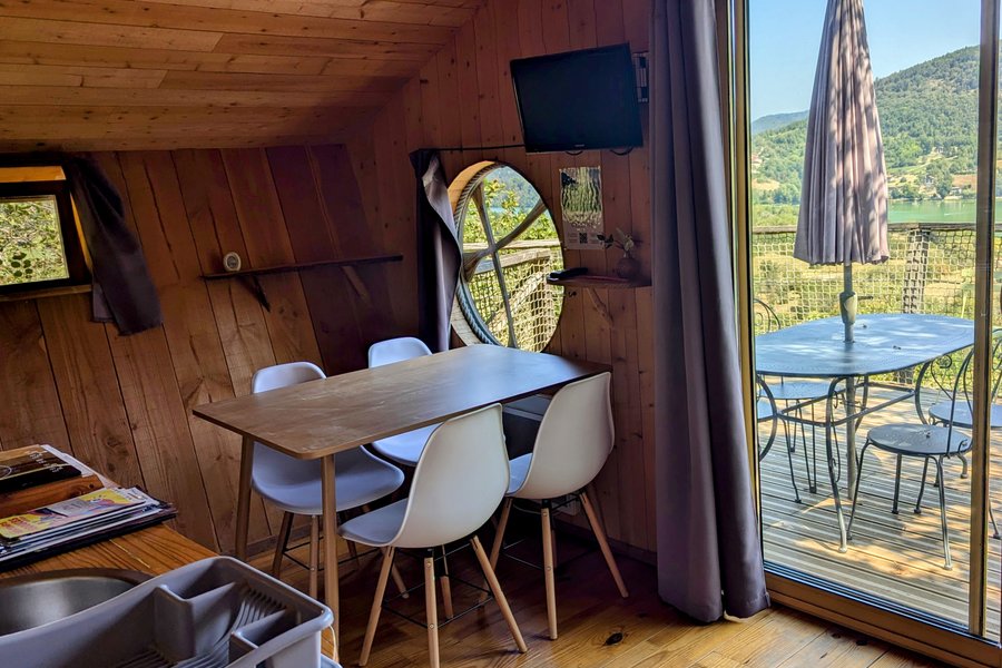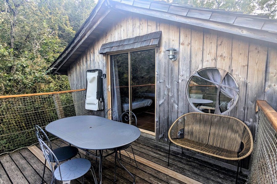 Découvrez la Cabane La Pinède avec Dôme SPA, un refuge paisible niché entre les arbres et construit sur pilotis.