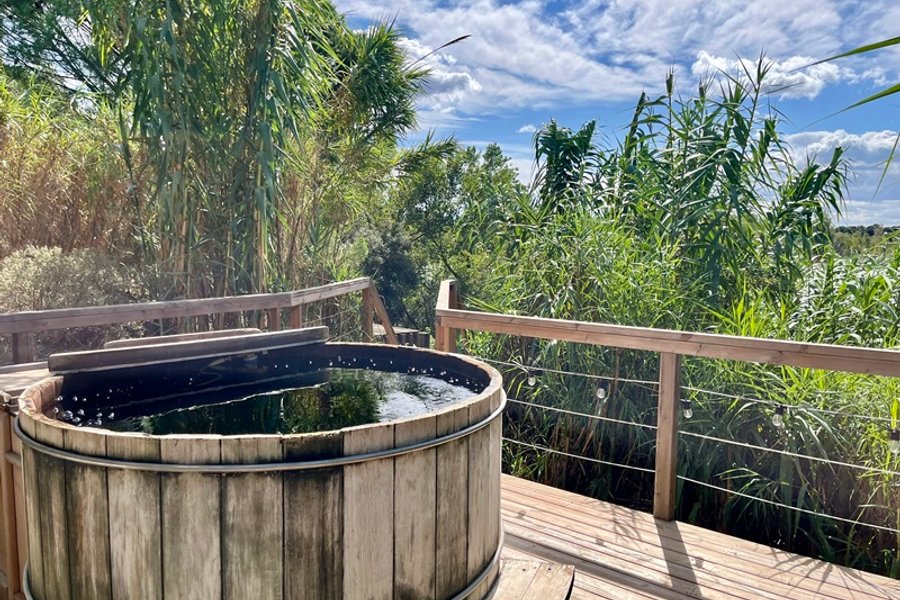 Laissez-vous bercer, grâce à un filet suspendu au dessus de l'eau, et profitez de la Cabane Spa Éternelle pour vivre un séjour d'exception.