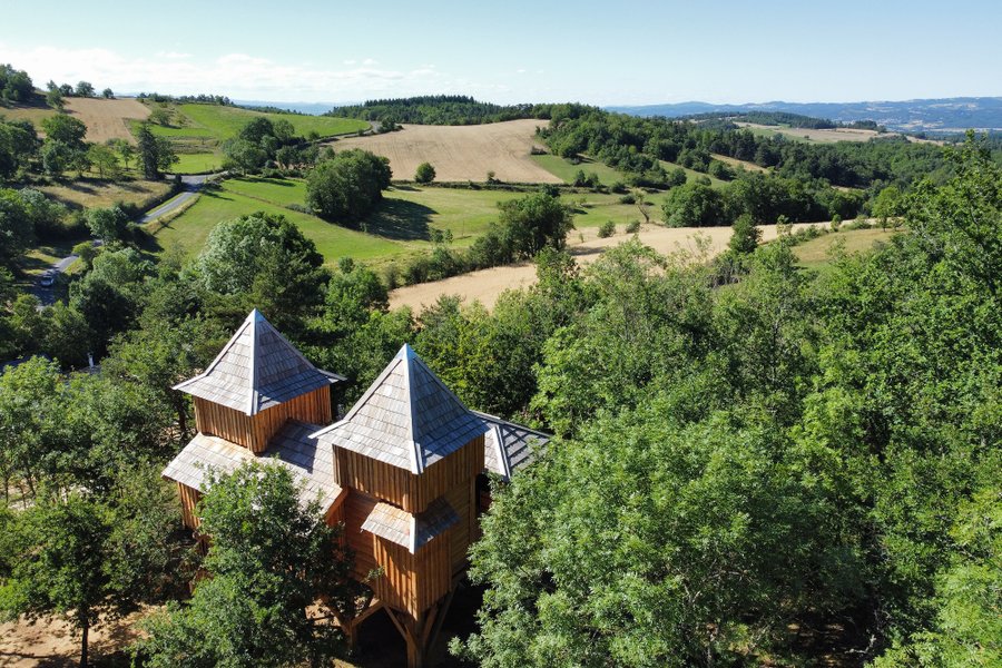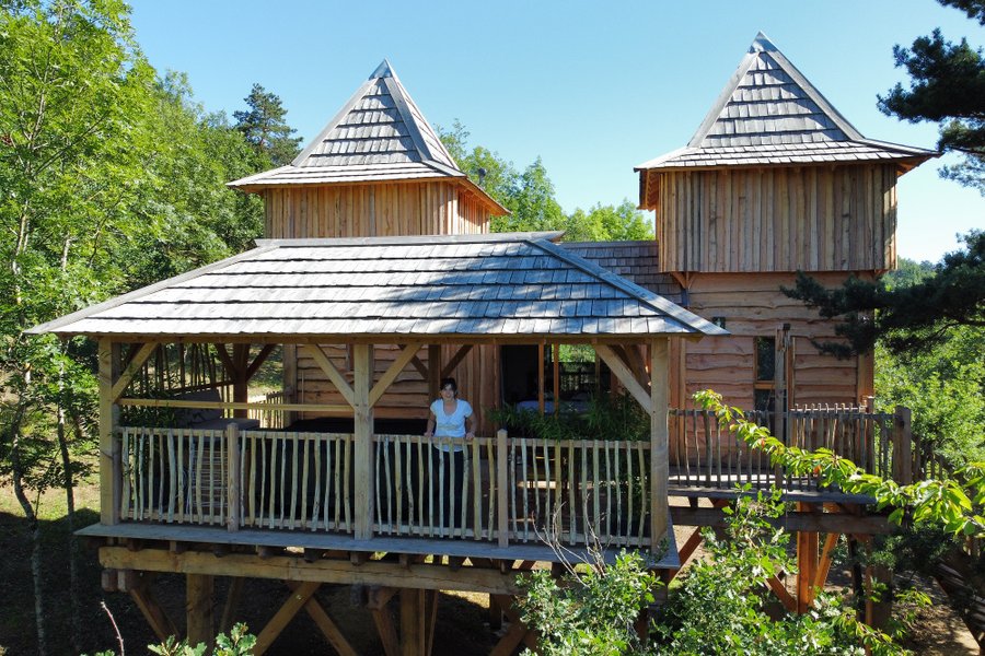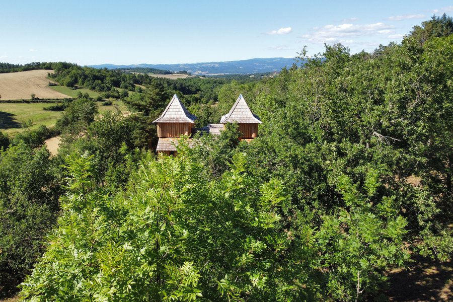 Inspirée par le château fort d’Aulteribe situé dans le Puy-de-Dôme, cette cabane d’exception de 88m2 perchée à plus de 4m de hauteur avec sa tour qui culmine à plus de 15m de hauteur fera le bonheur des familles et des couples.