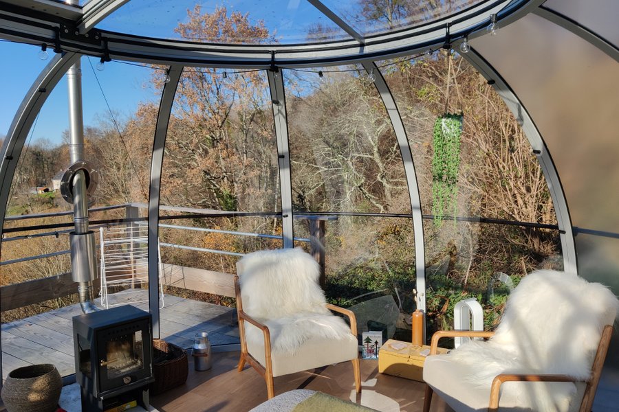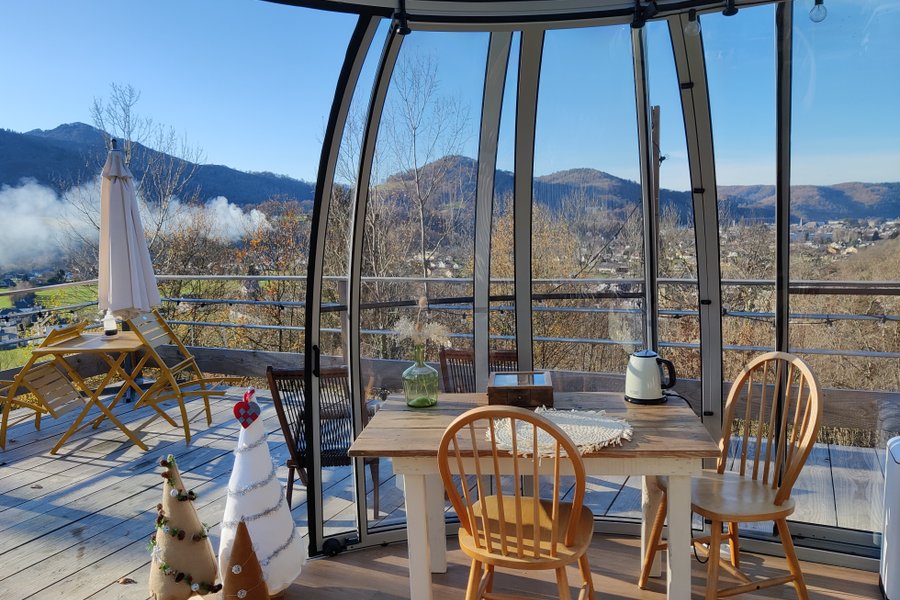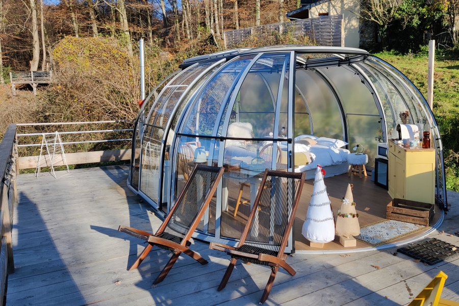 La Canopée est un dôme ovale permettant de vivre dedans comme dehors. Entièrement transparent il permet de voir la nature et le ciel par tout temps. La vue sur la vallée et les montagne donne l’impression d’être seuls au monde.Romantique à souhait vous pourrez profiter à deux du bain nord……
