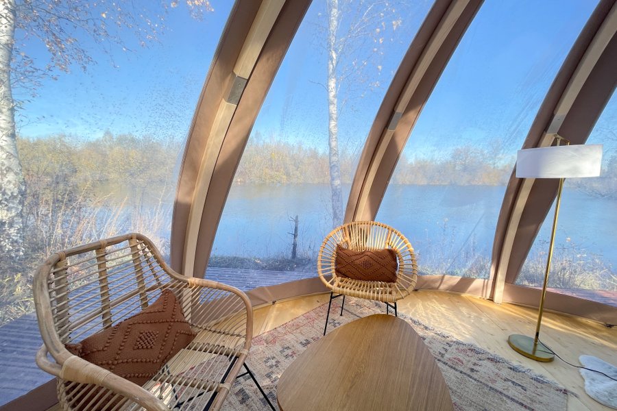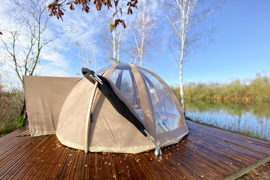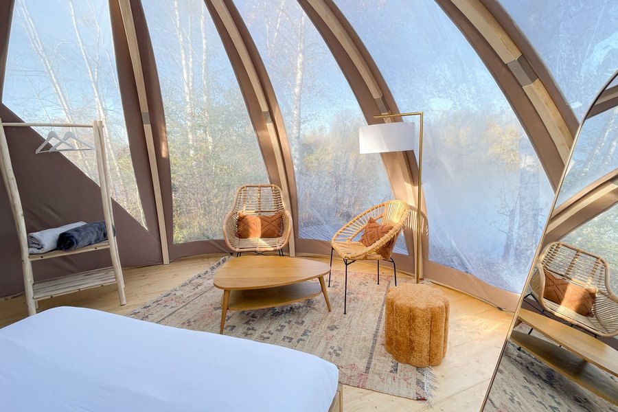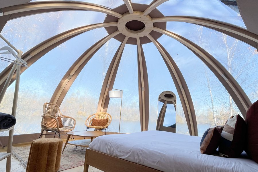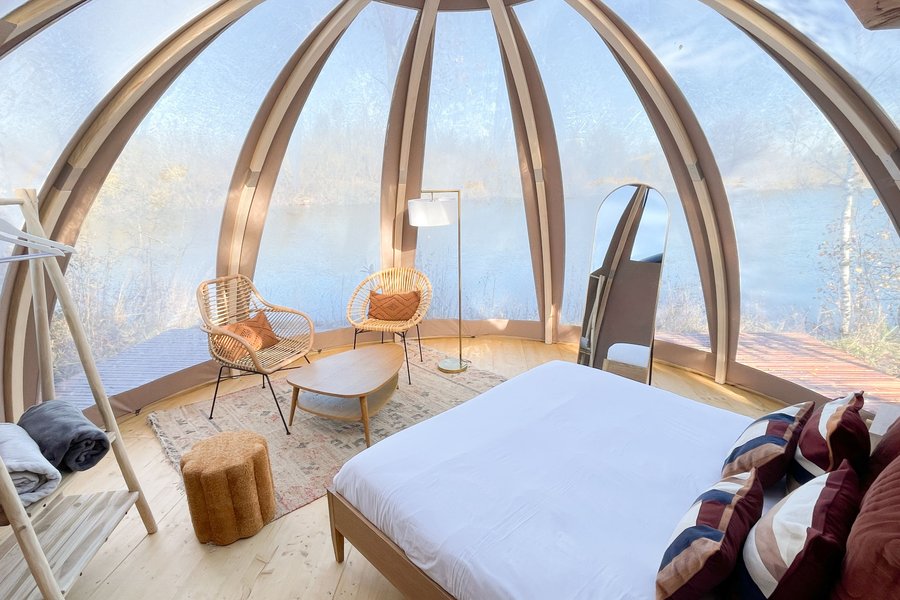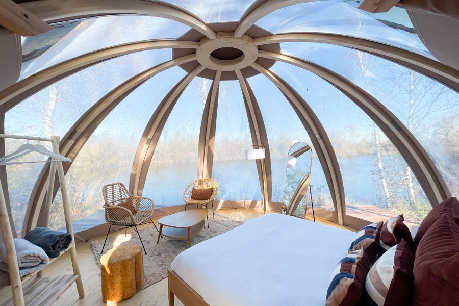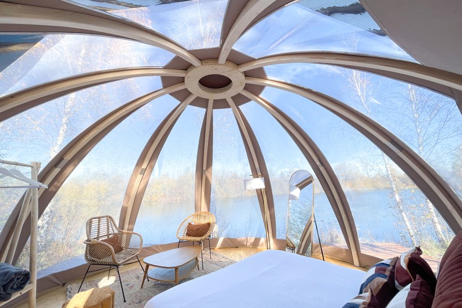 Accessible par un sentier privé, ce dôme au toit transparent vous plonge au cœur de la nature avec une vue spectaculaire sur l’étang et le ciel étoilé.