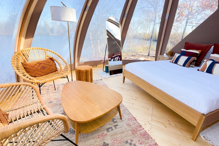 Bienvenue dans votre Dôme ! En plein cœur du Domaine, idéalement situé sur le parc arboré et à proximité des étangs, prenez le temps de vous ressourcer dans ce chaleureux cocon aux formes organiques.