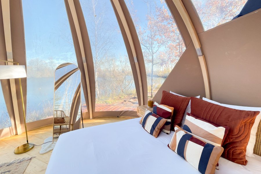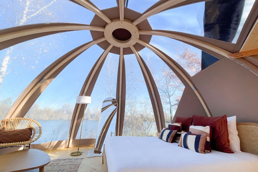 Accessible par un sentier privé, ce dôme au toit transparent vous plonge au cœur de la nature avec une vue spectaculaire sur l’étang et le ciel étoilé. Inondé de lumière, il offre un cadre chaleureux où vous pourrez admirer l’eau directement depuis votre lit, faisant de ce lieu un véritable coco……