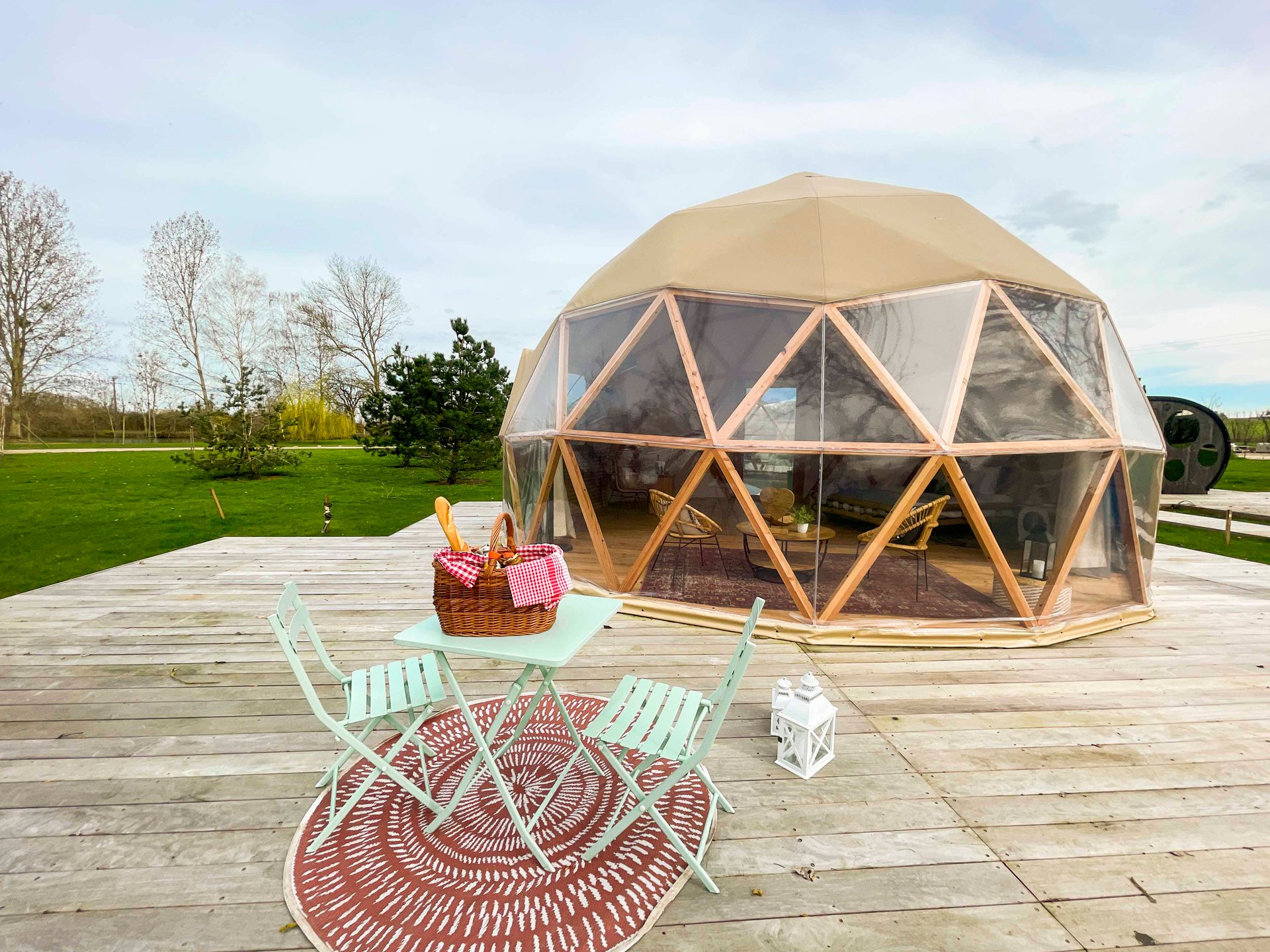 Accessible par un sentier privé, ce dôme au toit transparent vous plonge au cœur de la nature avec une vue spectaculaire sur l’étang et le ciel étoilé.