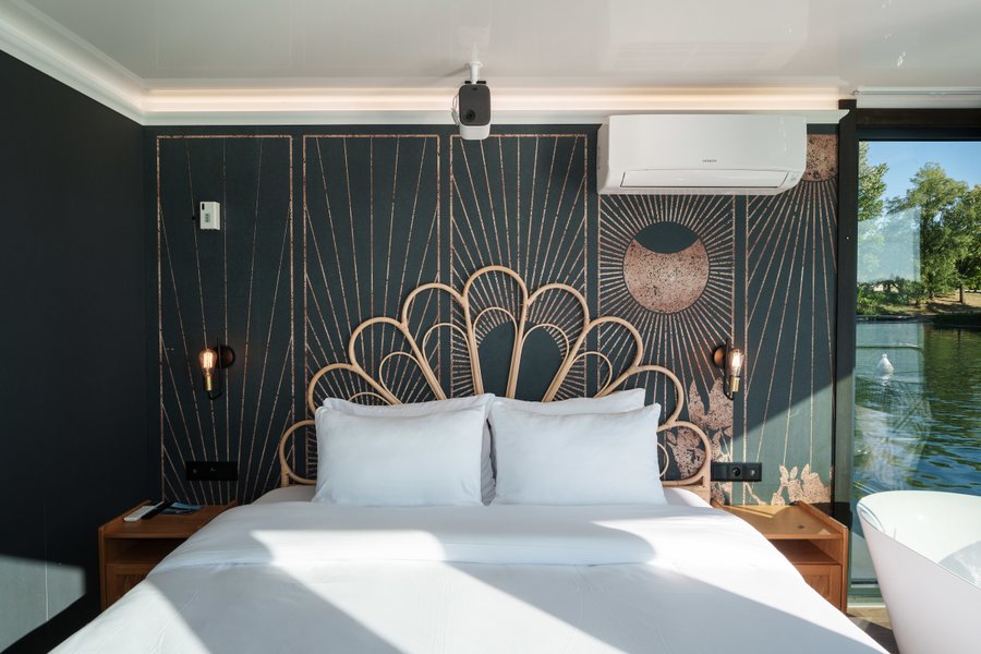 Élégance, originalité et bien-être sur l’eau Offrez-vous une parenthèse insolite et luxueuse à bord de cette suite flottante de 28 m², nichée à L’Isle-Adam.