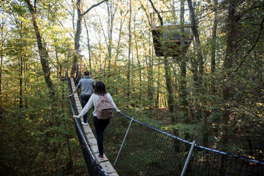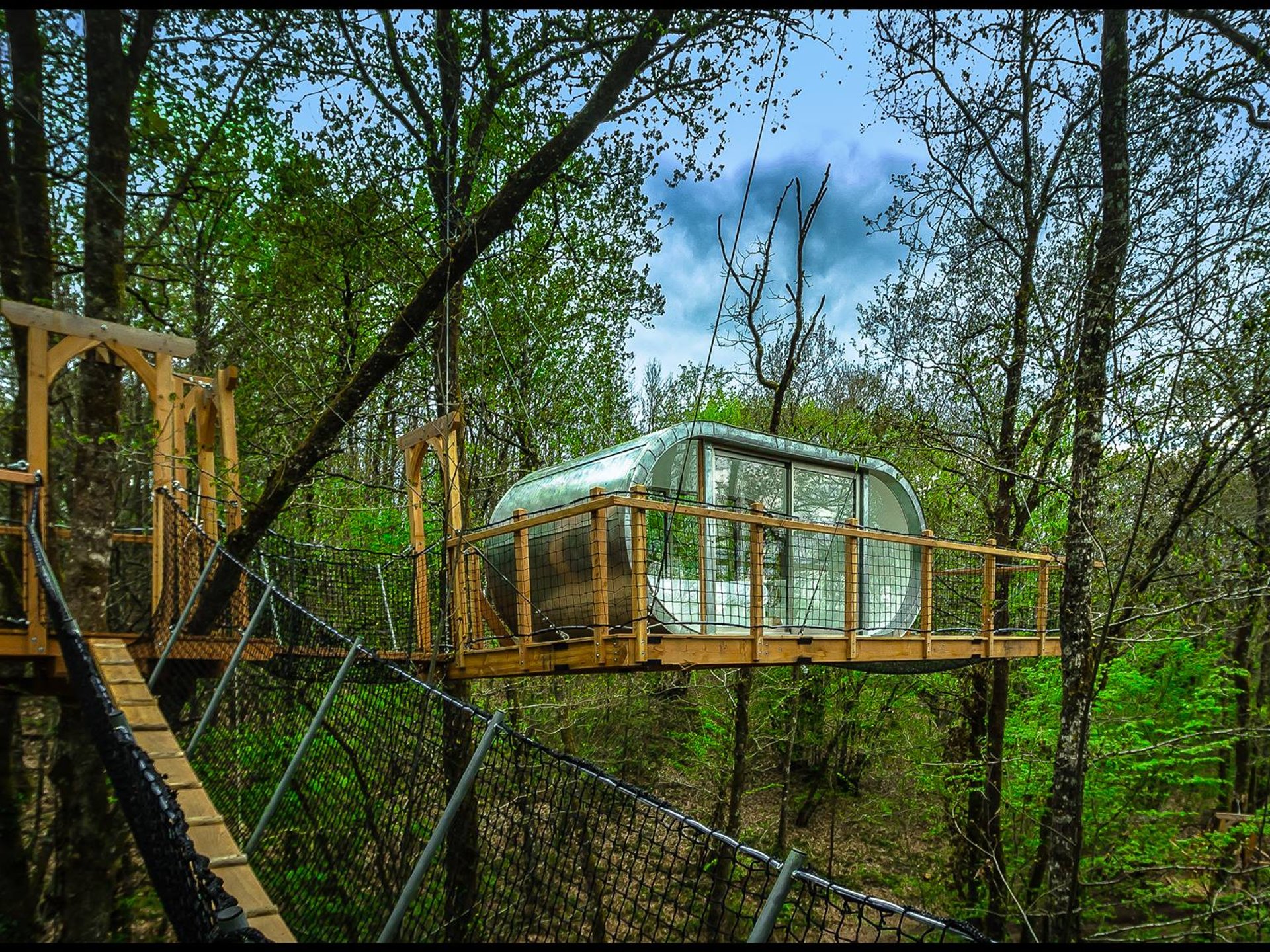 Cette cabane est accessible par plusieurs ponts de singe sécurisés et par une échelle. …