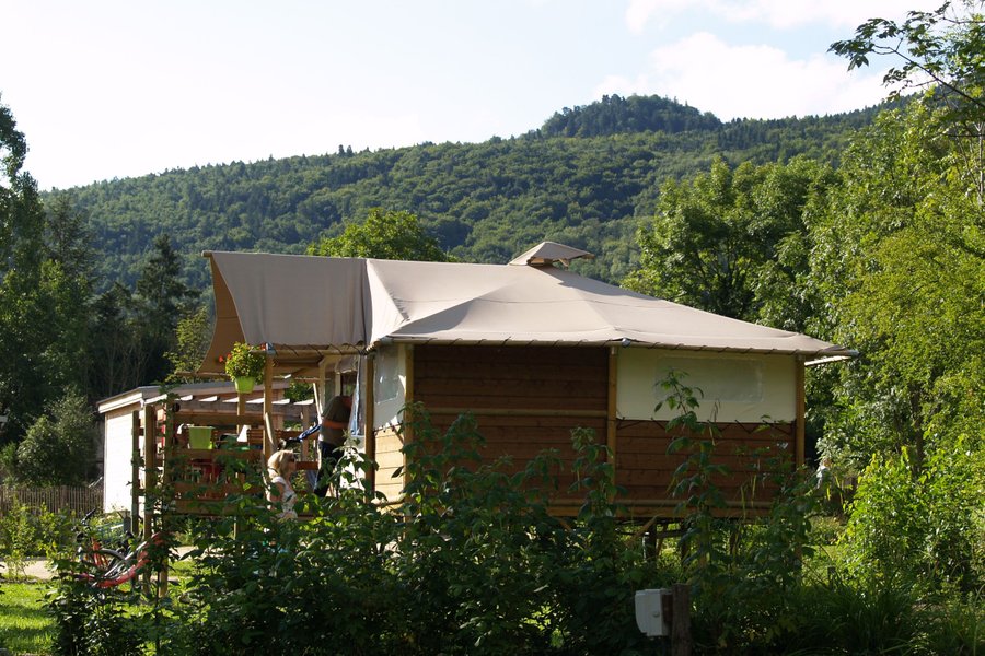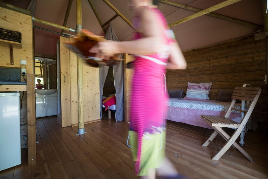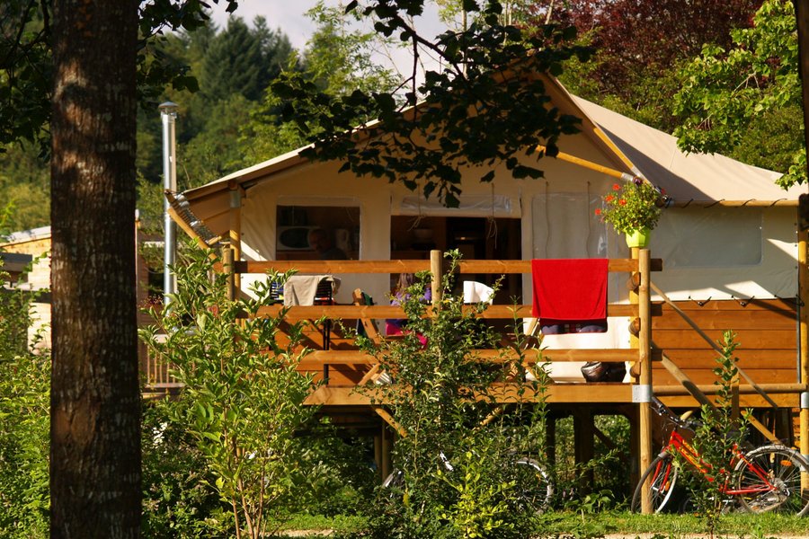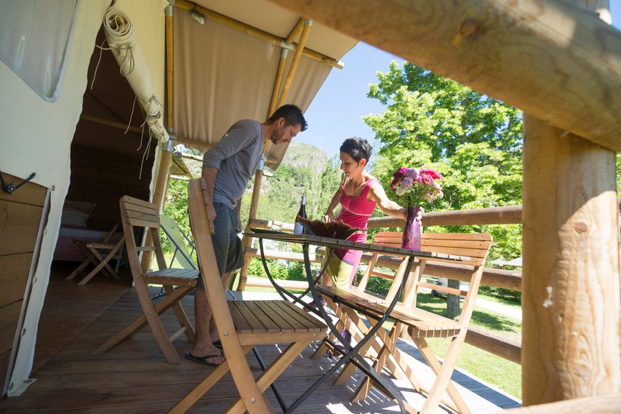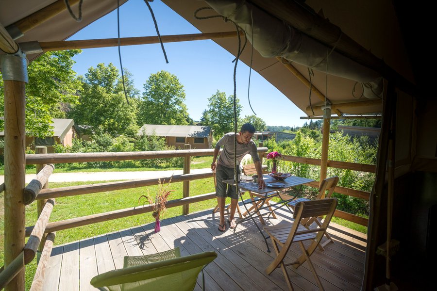 Jouer au camping confortablement, c'est possible ! Posez vos valises et improvisez vous campeur dans une grande tente de 20 m² à ossature bois installée sur un plancher parmi les emplacements nus des "vrais" campeurs.