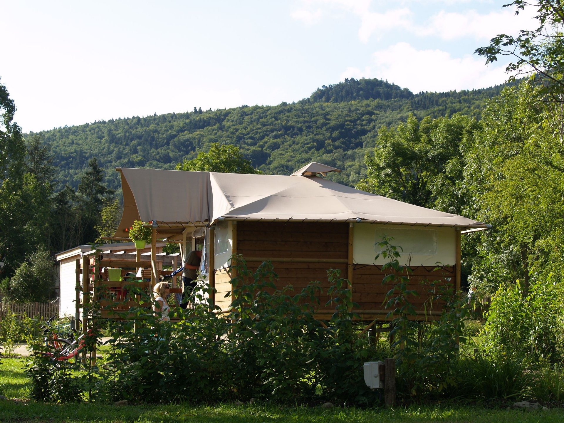 Venez jouer au camping ! Sur un vaste emplacement de 200m², la tente trappeur est installée sur un plancher de 35m², ses ouvertures sont modulables et sa grande terrasse est ombragée.