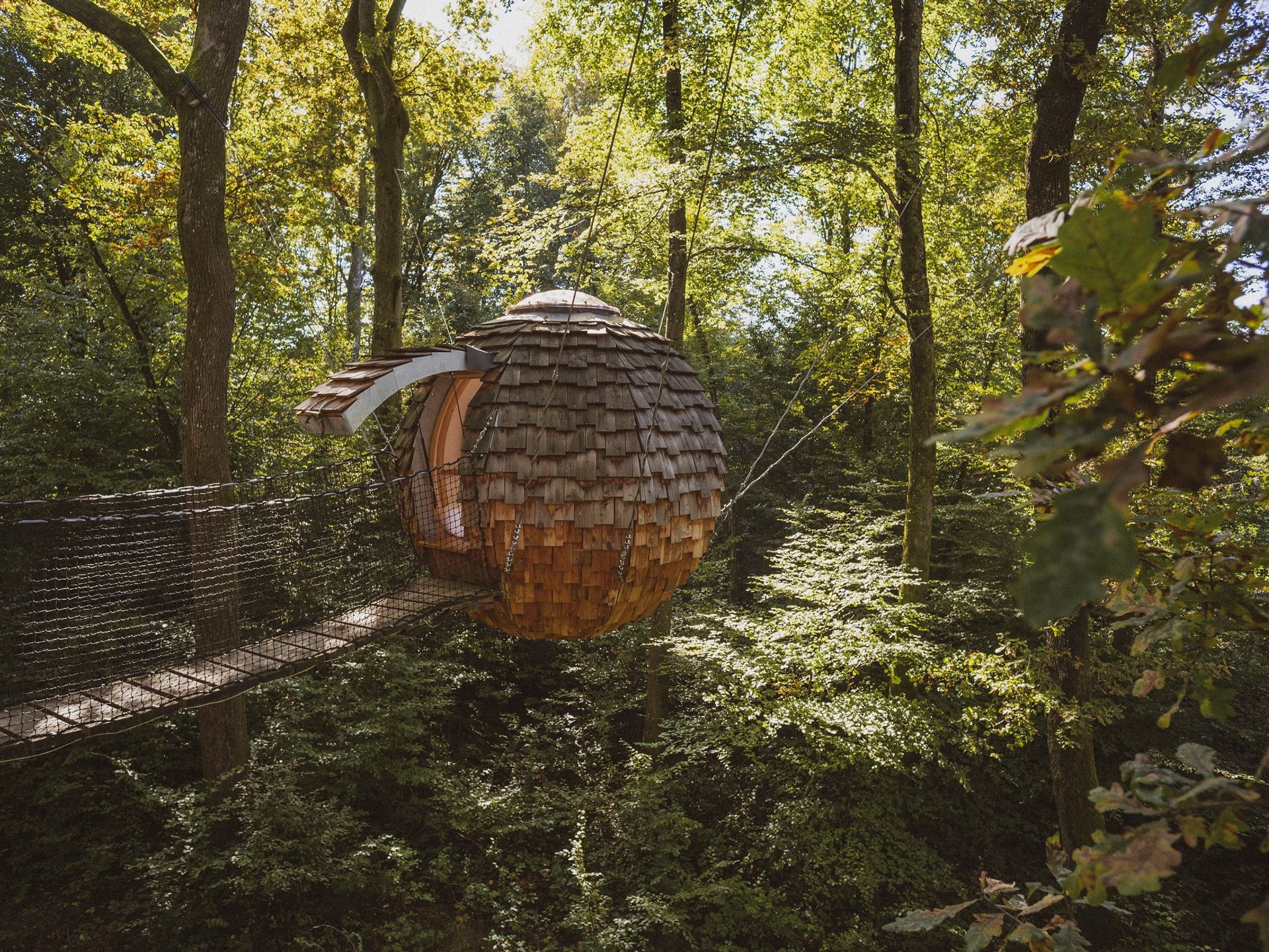 Accessible par un escalier en colimaçon, la cabane Spa Vertige sera votre nid d'amour, à plus de 10 mètres de hauteur.