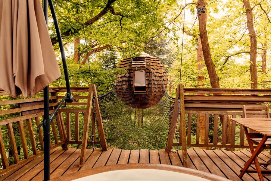 Profitez d'une escapade en amoureux dans un cocon suspendu dans les arbres ! La Cabane "Spa Cocoon d'Amour" est un véritable nid douillet pour les amoureux de nature.