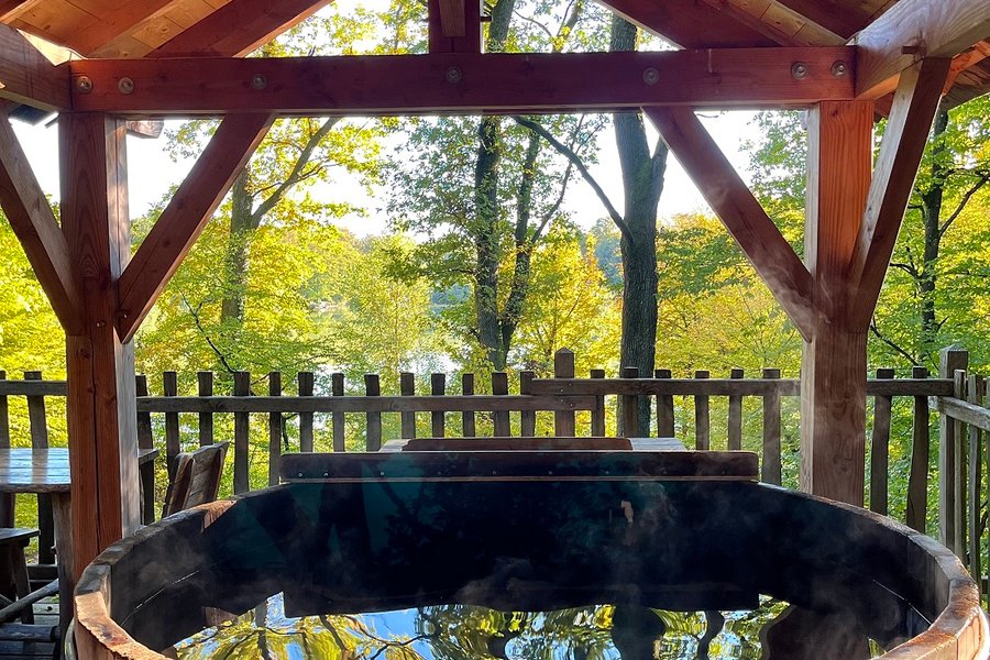 Accessible par un escalier, la cabane Spa Détente sera votre nid d'amour perché au milieu des arbres à 6 mètres de hauteur ! Détendez vous, relaxez vous, et profitez de votre bain nordique à 40°C avant de retrouver votre chambre avec une vue imprenable sur les arbres.