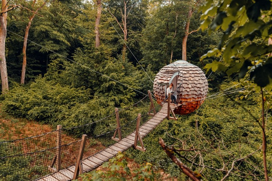 Pour partager un moment unique à deux, la Cabane Spa Echo est idéale ! Ce cocon dans les arbres est accessible par un double escalier.