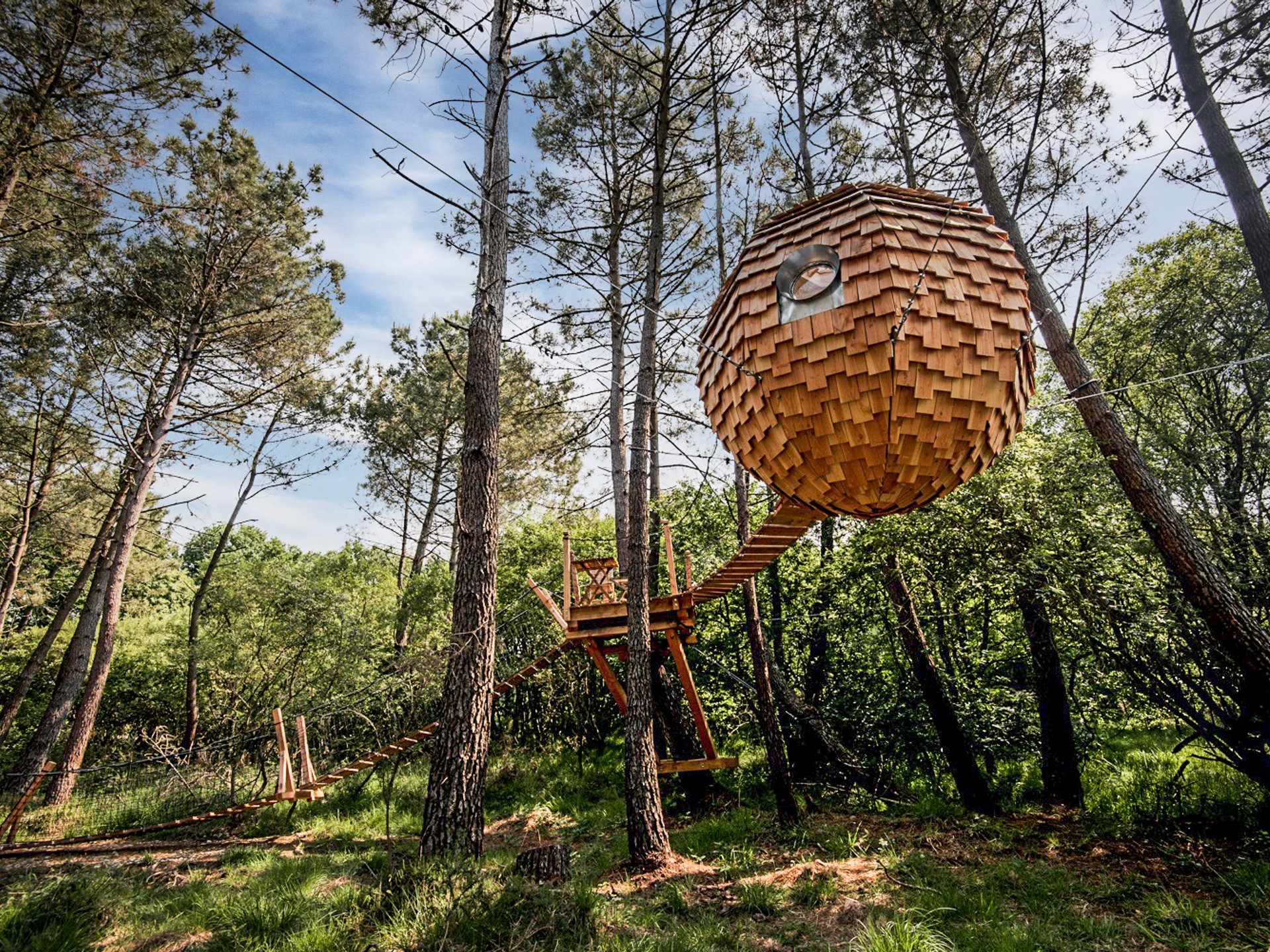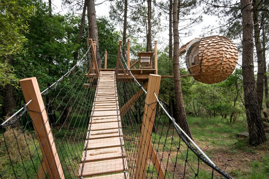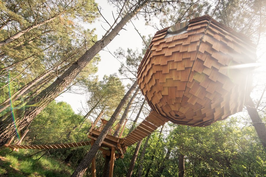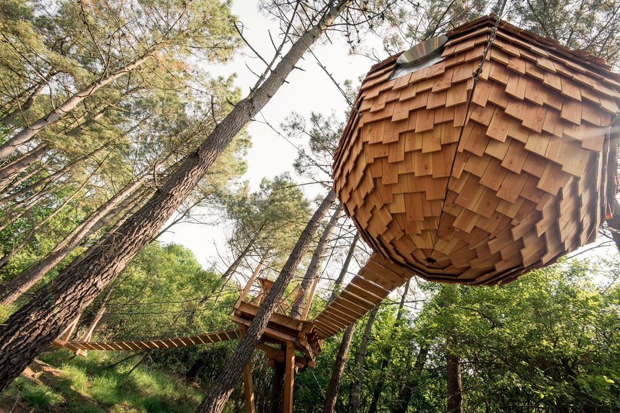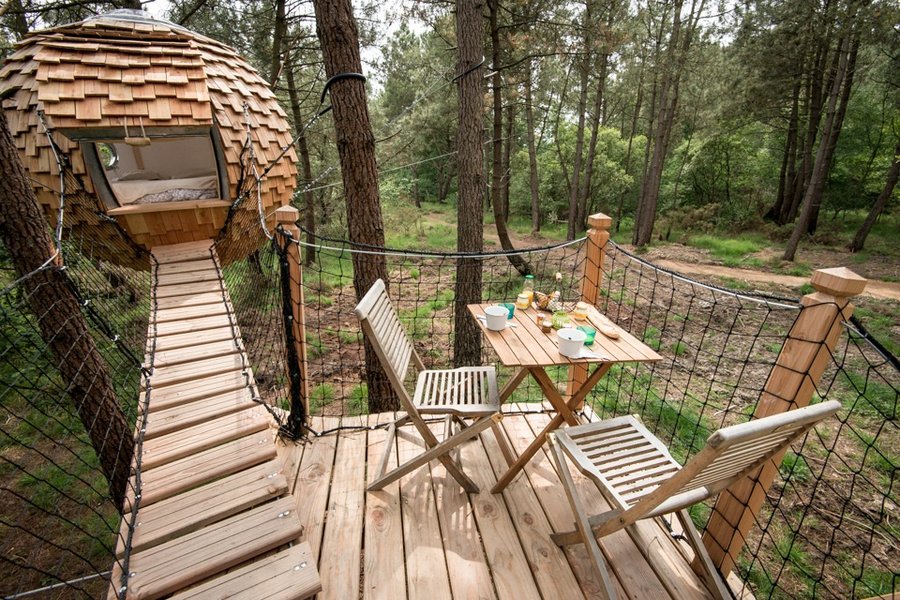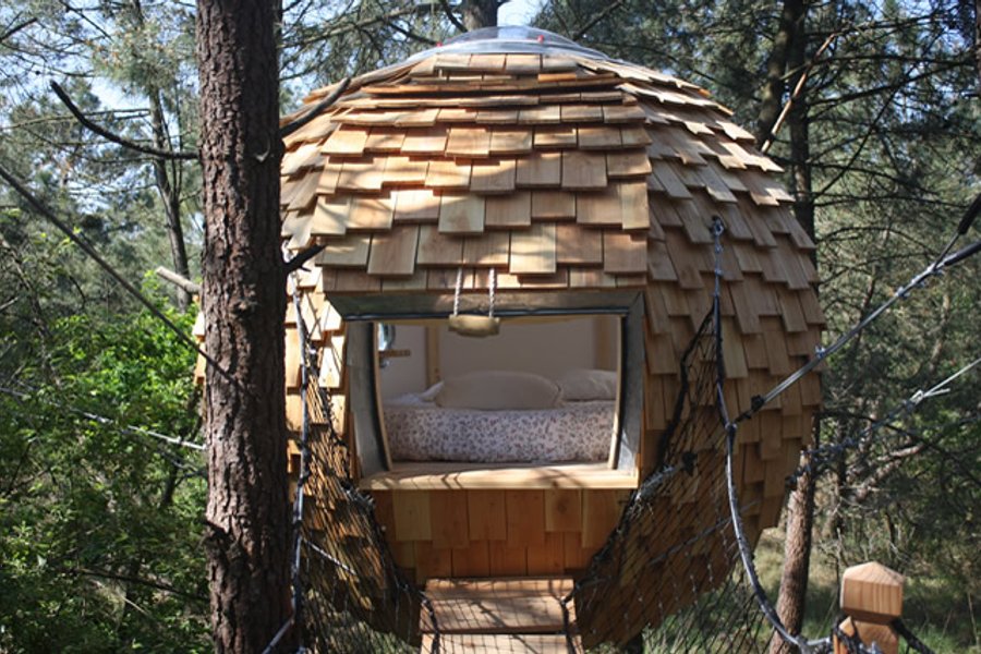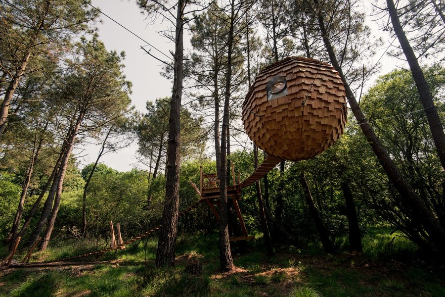 Au milieu d’un bois de pins maritimes, la cabane dans les arbres Baman, signifie "Se poser"
