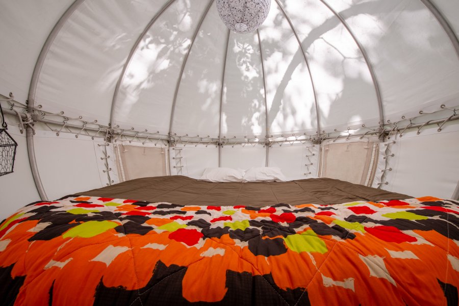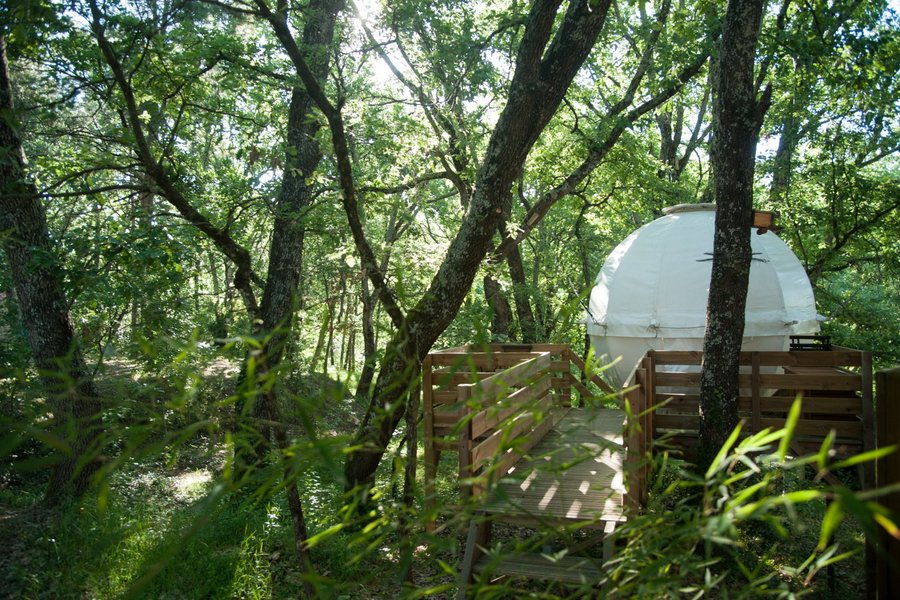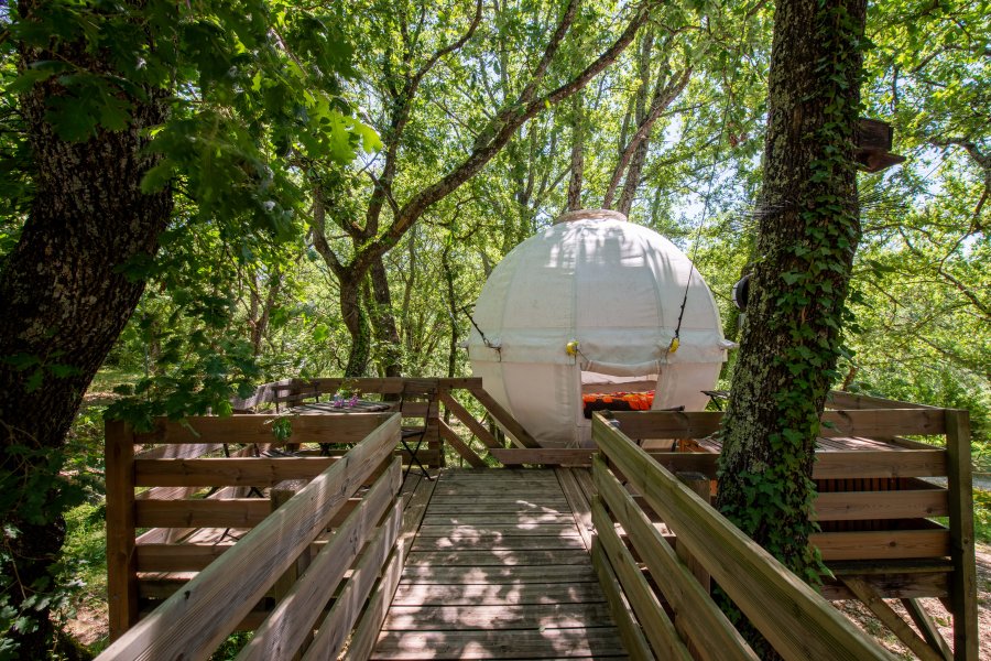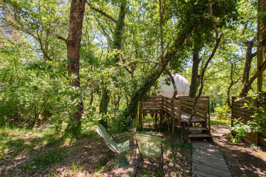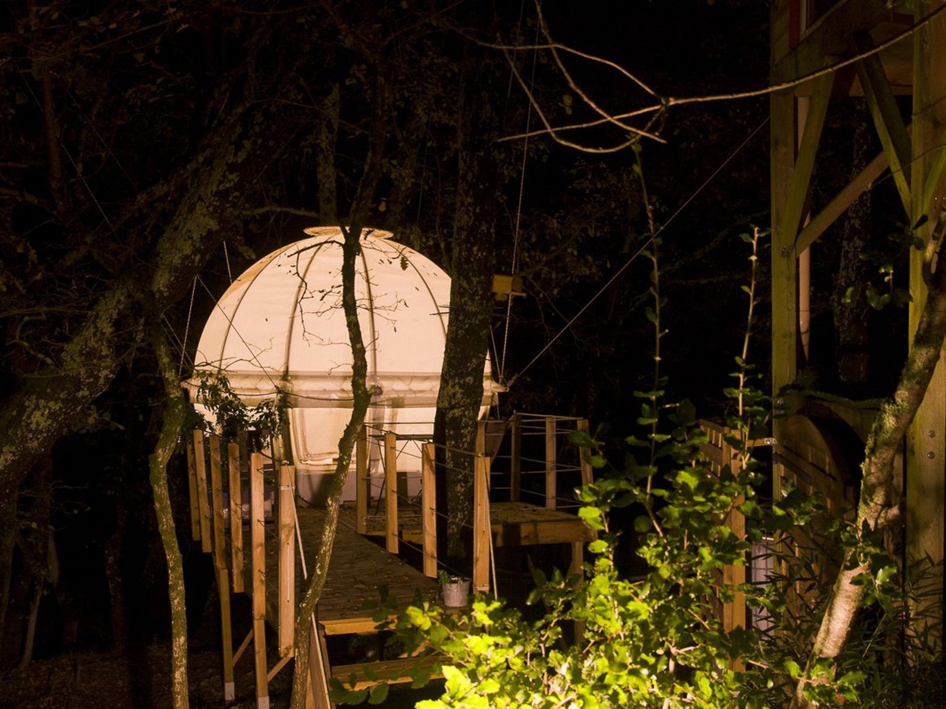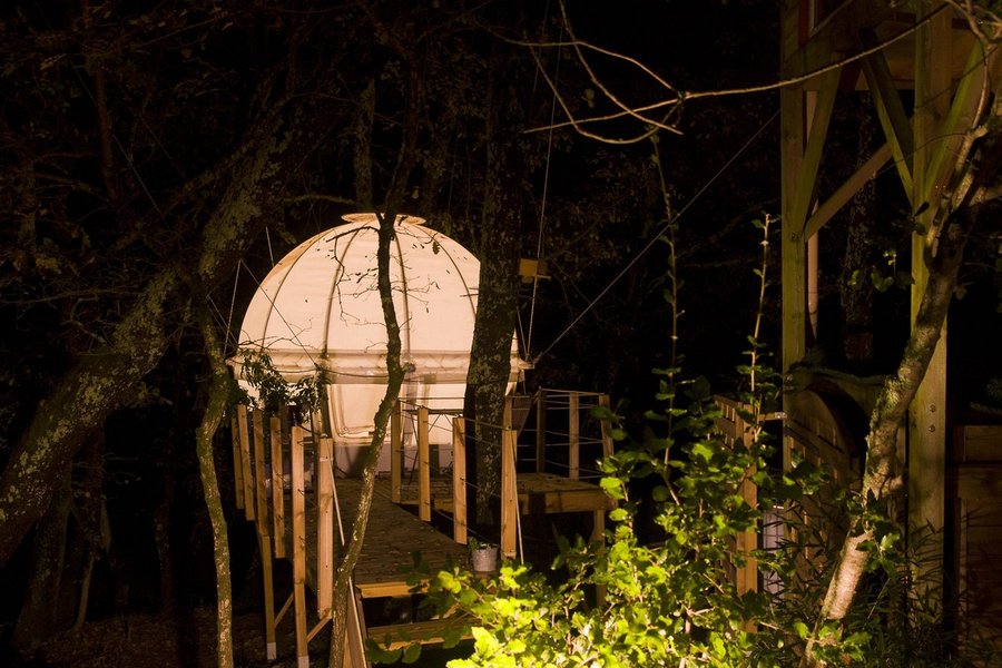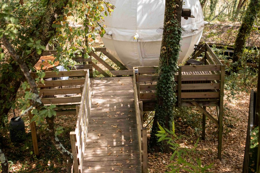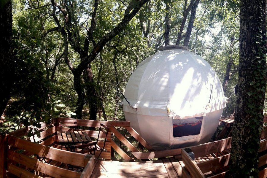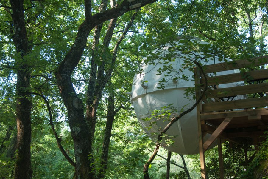 Votre nid est une grande tente sphérique (pas de chauffage) suspendue dans les chênes. Il se balance donc au gré du vent.
