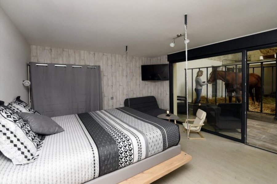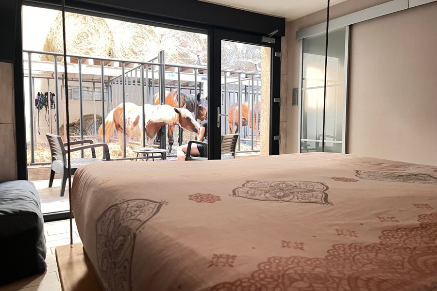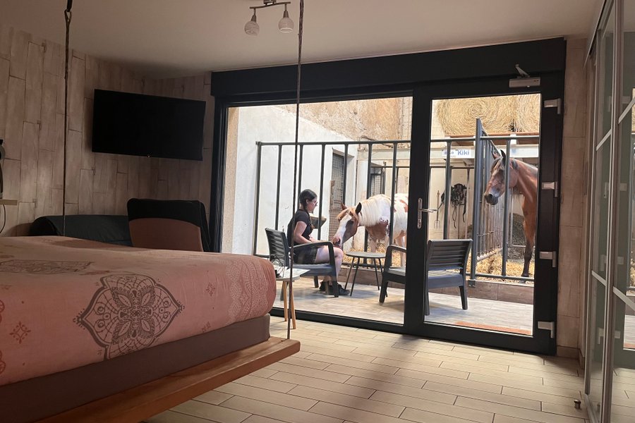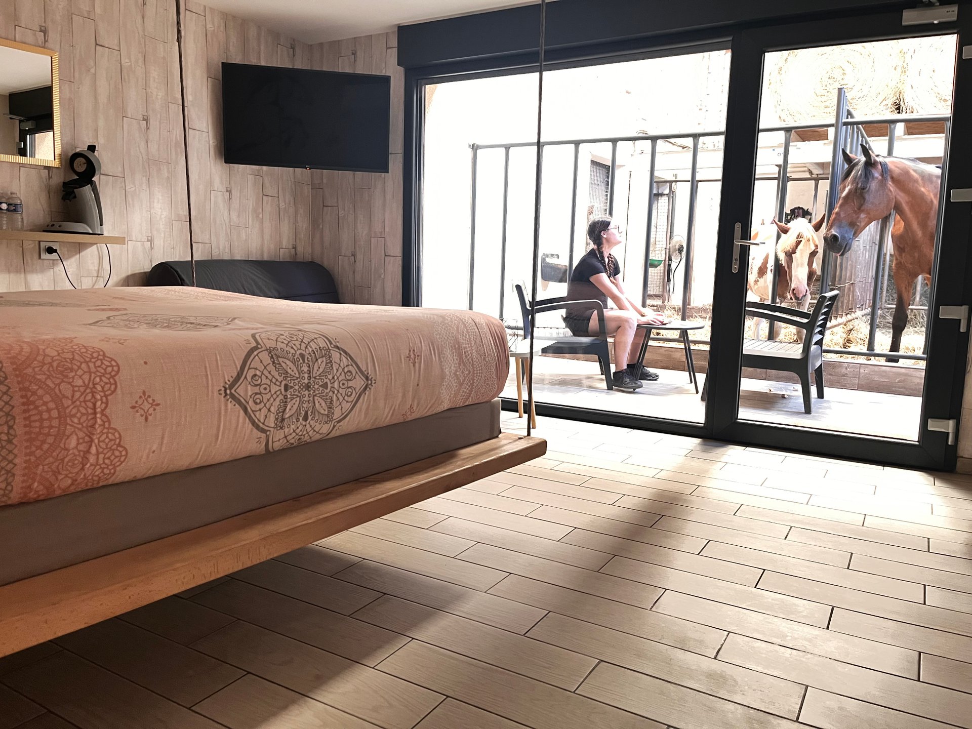 Chambre 4 – 3 pers. vue panoramique sur l’ensemble des chevauxChambre 5 vue panoramique 4 pers.Lodge 2 – 4 pers. terrasse avec des chevaux à votre chevet