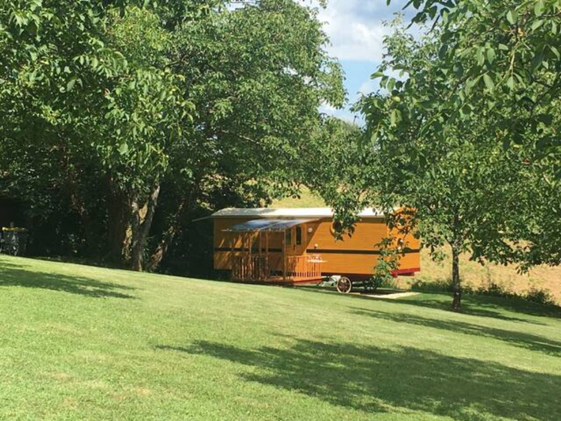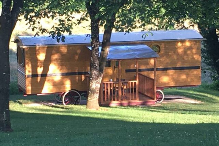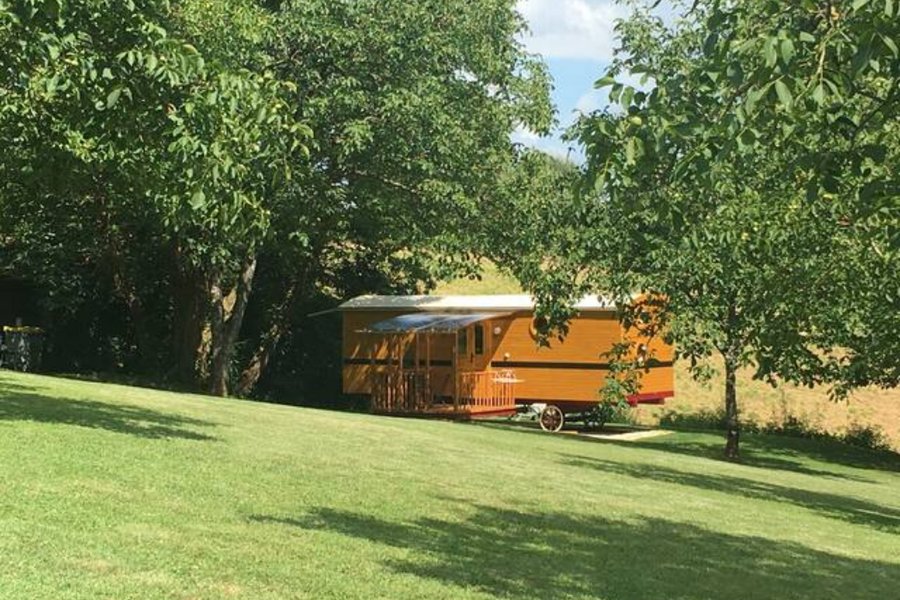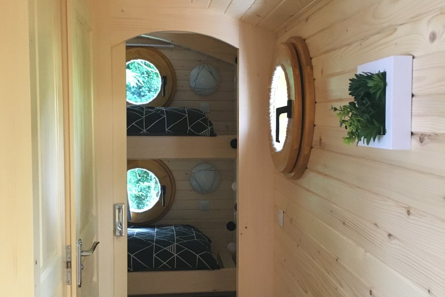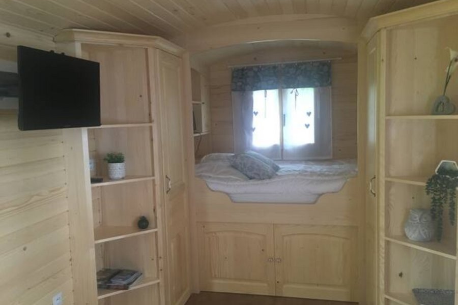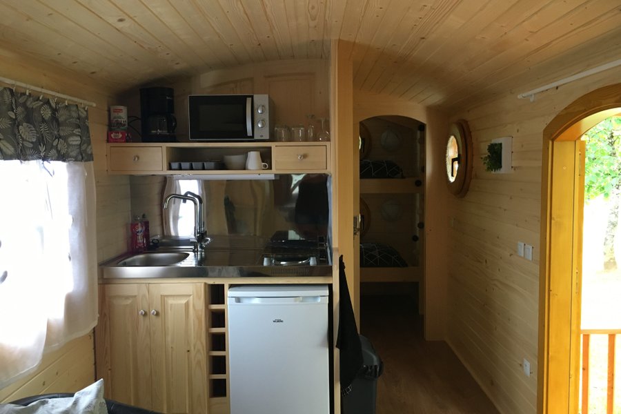 Bienvenue dans votre cocon !En montant les trois marches de la roulotte, vous découvrirez un espace ouvert incluant une kitchenette équipée pour quatre personnes (réfrigérateur, deux plaques électriques, micro-ondes et vaisselle complète). De quoi passer de bons moments avec vos proches.……