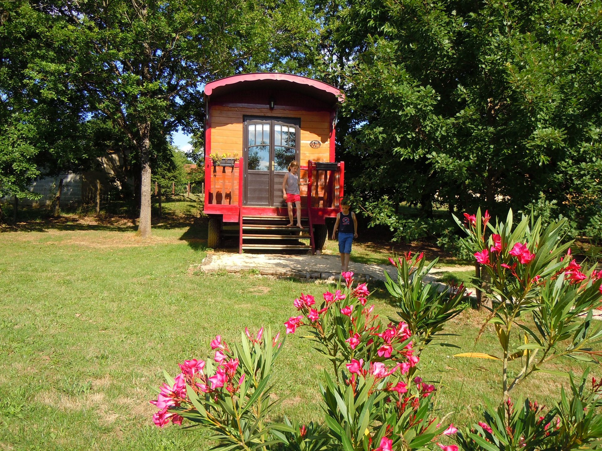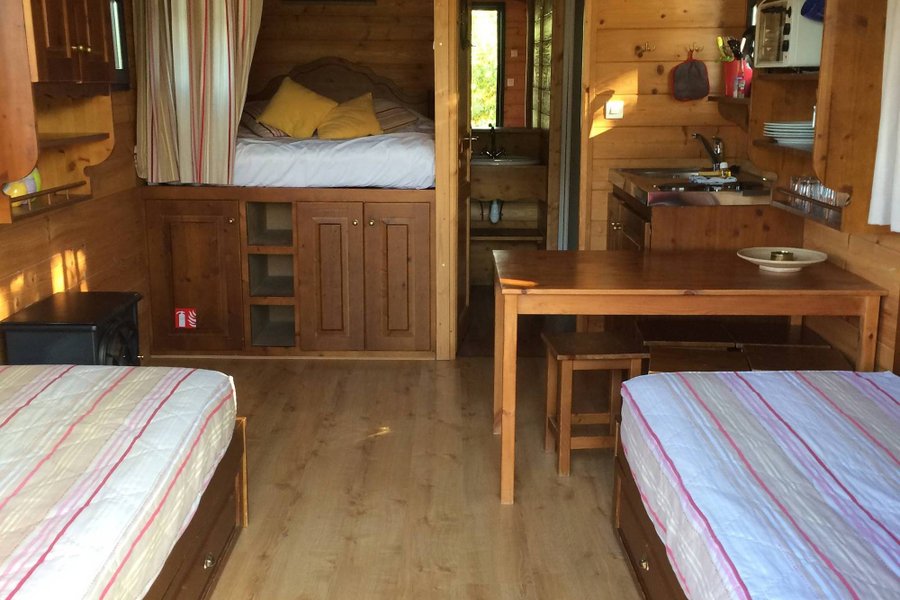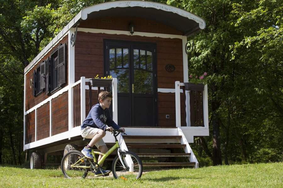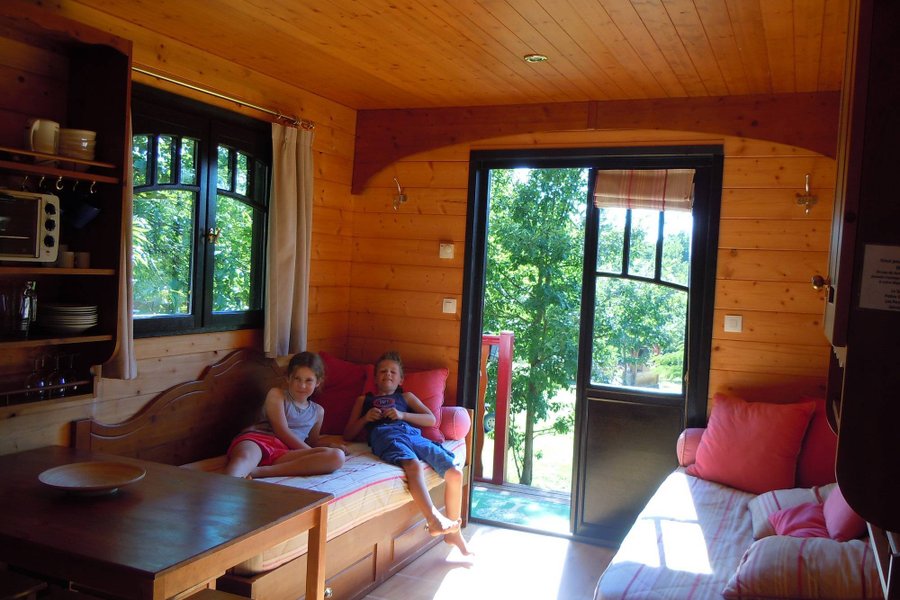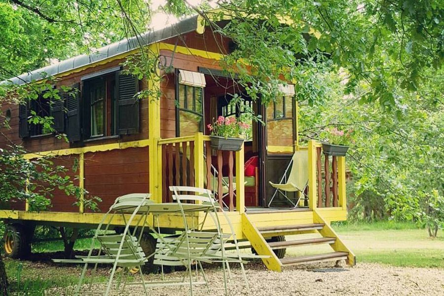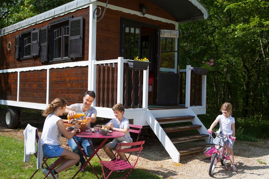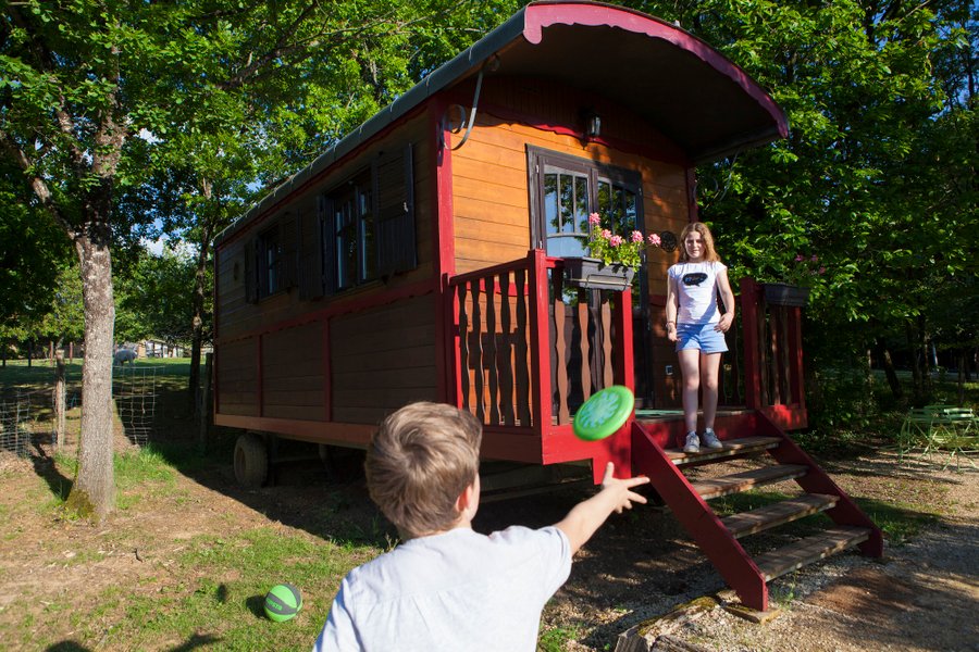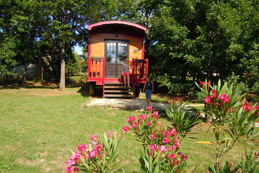 C’est au cœur d’une ferme périgourdine, que vous vivrez un séjour en famille ou à deux dans une roulotte pleine de charme.À l’orée d’un bois, les roulottes sont installées sur un site arboré et calme. Elles disposent d’une terrasse privée avec salon de jardin et barbecue, sous les c……
