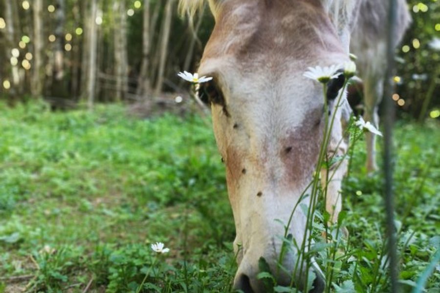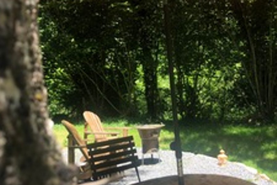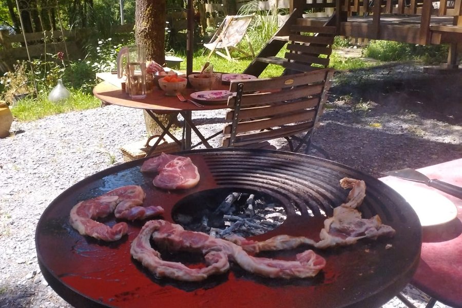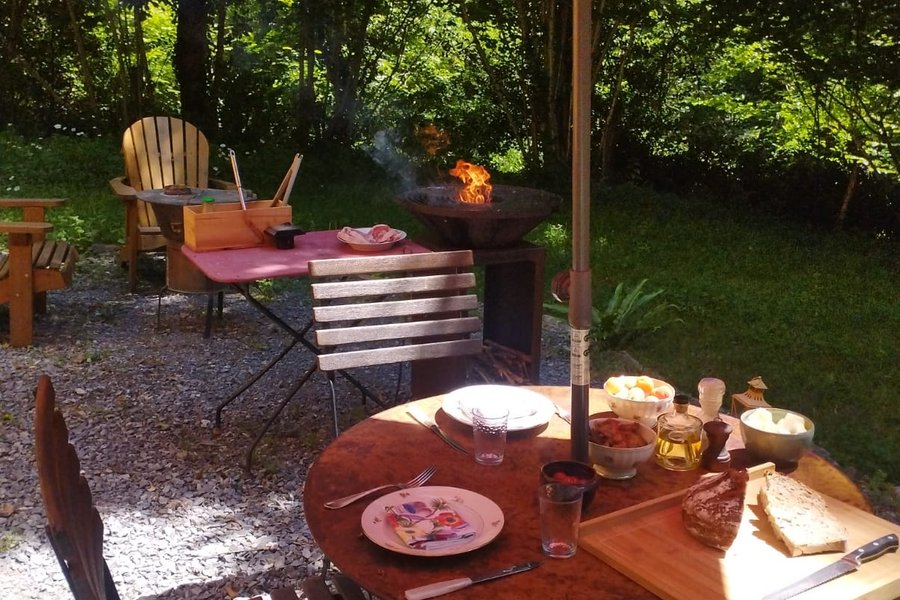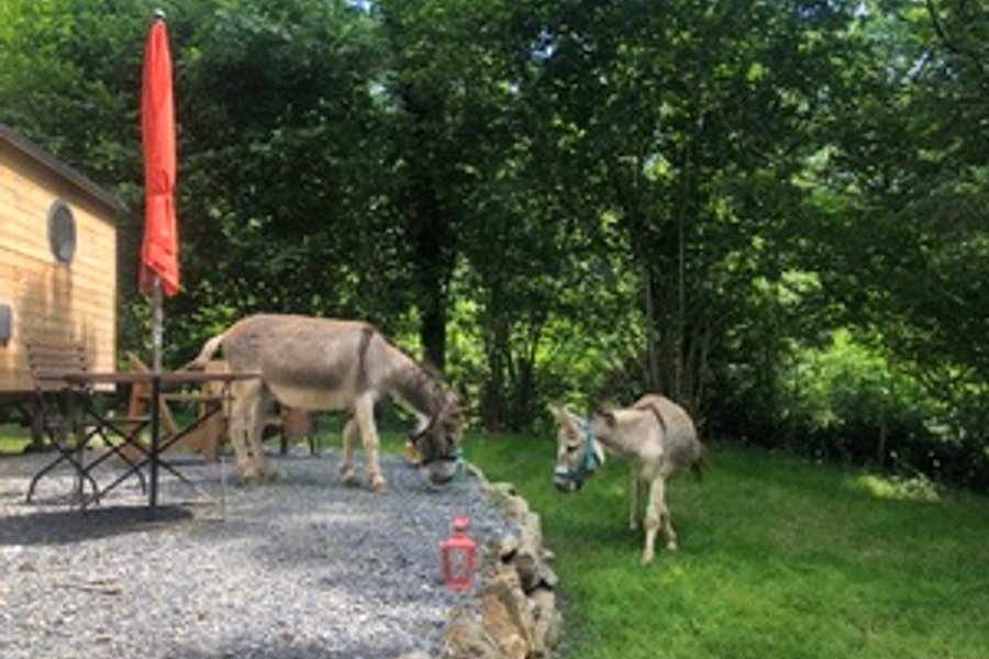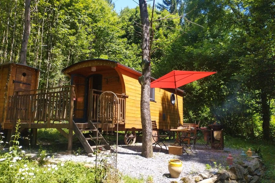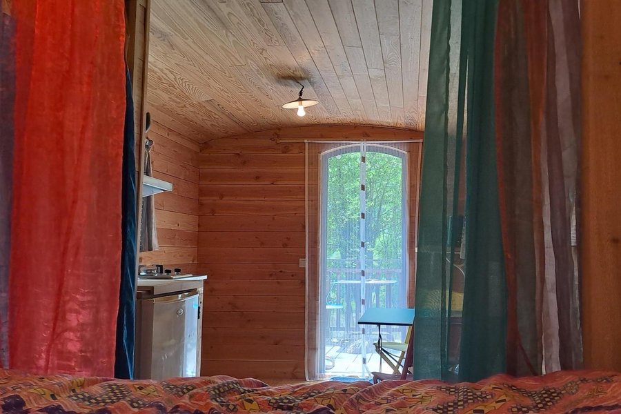 Située dans la forêt, à coté du parc des ânes, vous devrez emprunter un petit chemin légèrement grimpant pour accéder à la roulotte.
