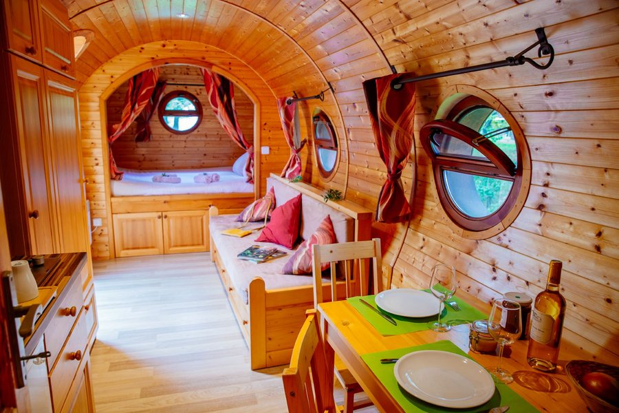 Hébergement sur la thématique œnologique, ces roulottes insolites sont une adaptation moderne de la roulotte traditionnelle. Entièrement modélisées sous la forme d’un fût en bois, à l’intérieur, elles sont aménagées dans un style très coco……