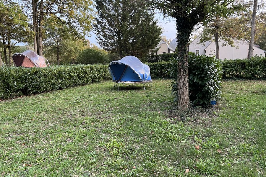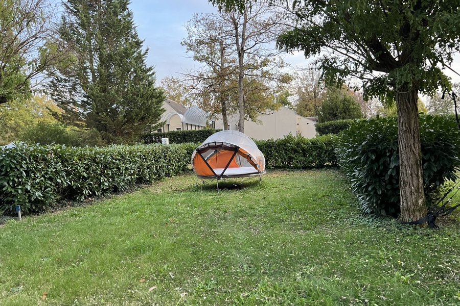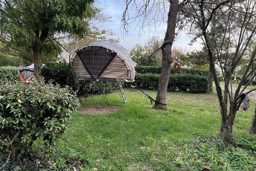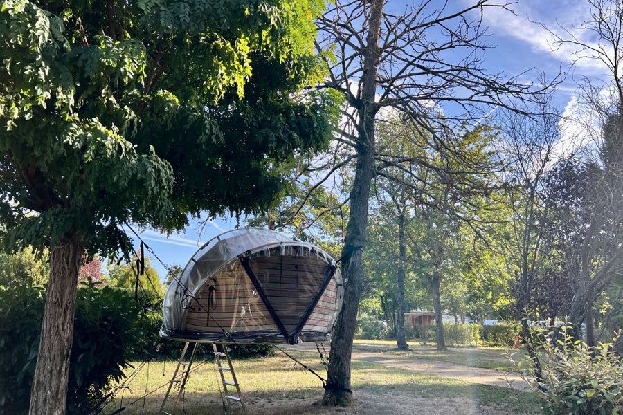 Venez découvrir cette petite tente sur pilotis en pleine nature au milieu de la verdure et des arbres.