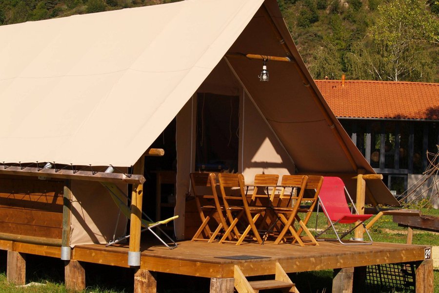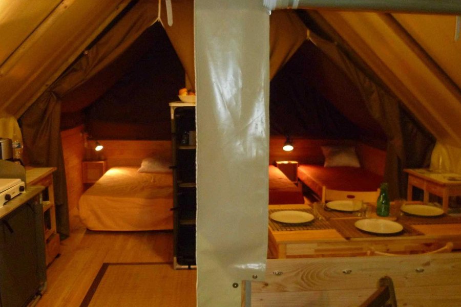 Jouer au camping confortablement, c'est possible ! Posez vos valises et improvisez vous campeur dans une grande tente de 20 m² à ossature bois installée sur un plancher parmi les emplacements nus des "vrais" campeurs.