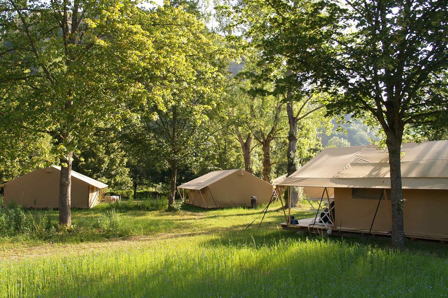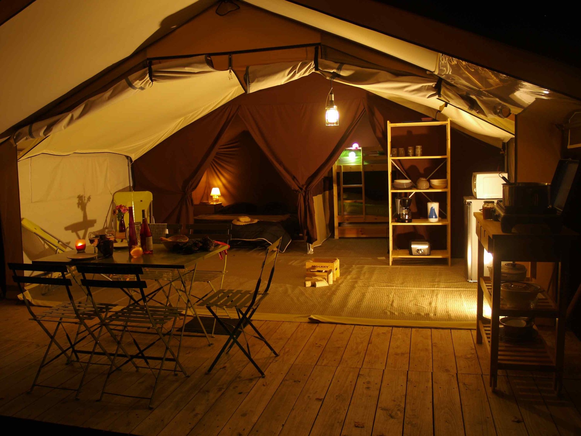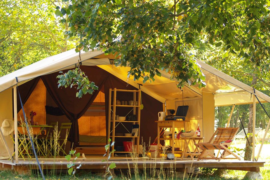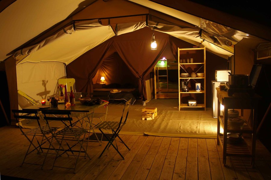 Jouer au camping confortablement, c'est possible ! Posez vos valises et improvisez vous campeur dans une grande tente de 20 m² à ossature bois installée sur un plancher parmi les emplacements nus des "vrais" campeurs.