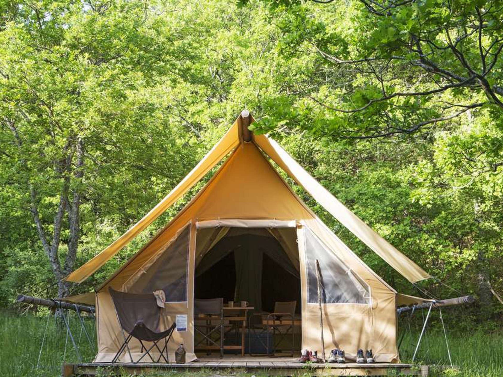 Inspirée des habitats des trappeurs du Grand Nord grâce à sa structure en toile et en bois, cette tente tout équipée séduira les amoureux de la nature.