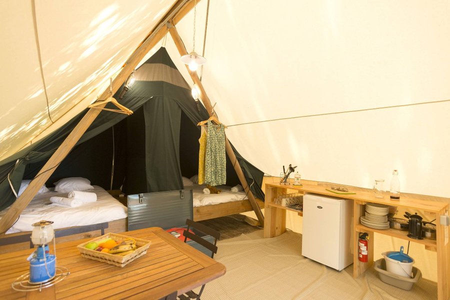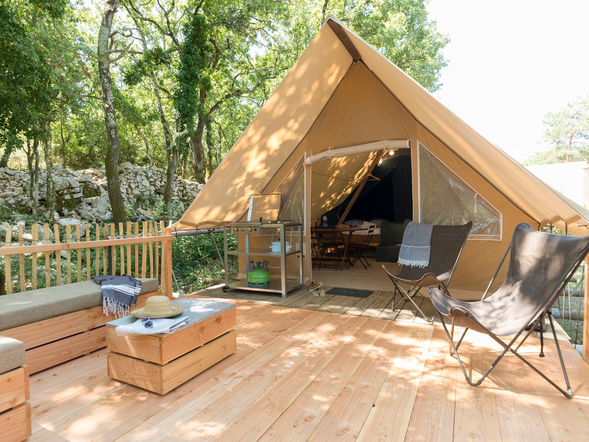 Dans cette Tente Toile et Bois design et tout confort, vous vivez la nature en toute sérénité !