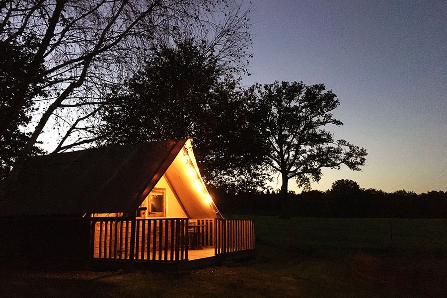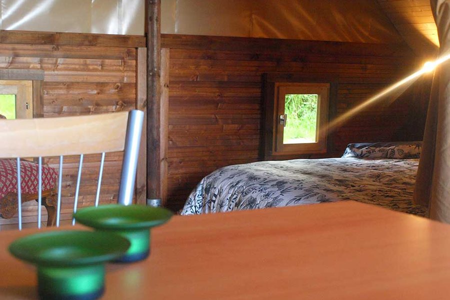 La tente Thym est une tente lodge toilée avec finition en bois, située au fond de notre jardin.