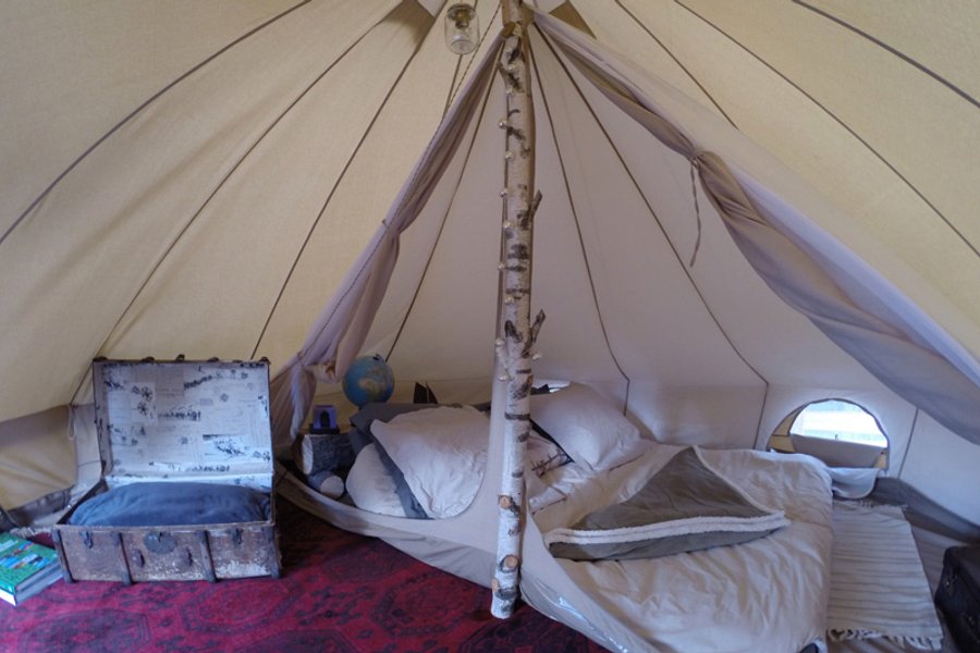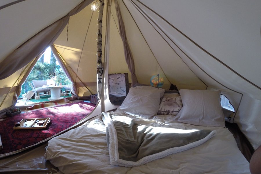 À 5 mètres de hauteur, cette tente atypique inspirée des tipis amérindiens vous invite à une échappée hors du temps. Accessible par un escalier en bois, elle s’ouvre sur une terrasse aménagée de banquettes et ……