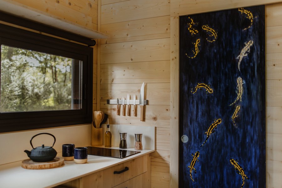 Dans le bleu intense d’une porte, les mystérieuses salamandres naviguent comme autant de constellations… Pour sa tiny house, Katerine Louineau, plasticienne engagée dans la défense des artistes-auteurs, a choisi dans son œuvre de donner vie aux salamandres tachetées qui parcourent la forêt d’O……