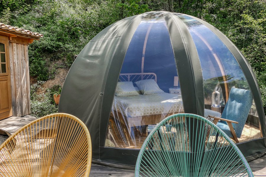 Profitez d’une belle nuit étoilée dans la Bulle Provence, un wigwam bulle semi-transparent équipé de tout le confort d’une chambre d’hôtel.À côté de votre bulle, une salle de bain avec WC, douche et lavabo vous attend dans une cabane en bois provençale réalisée par un artisan local. La te……